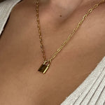 Колието „Златно Катинарче“ – Персонализирано с Гравиране е създадено да символизира любов, доверие и специална връзка. Златистата верижка е украсена с изящен катинар, чиято гладка повърхност е идеална за индивидуално гравиране – инициали, значима дата или кратко послание.