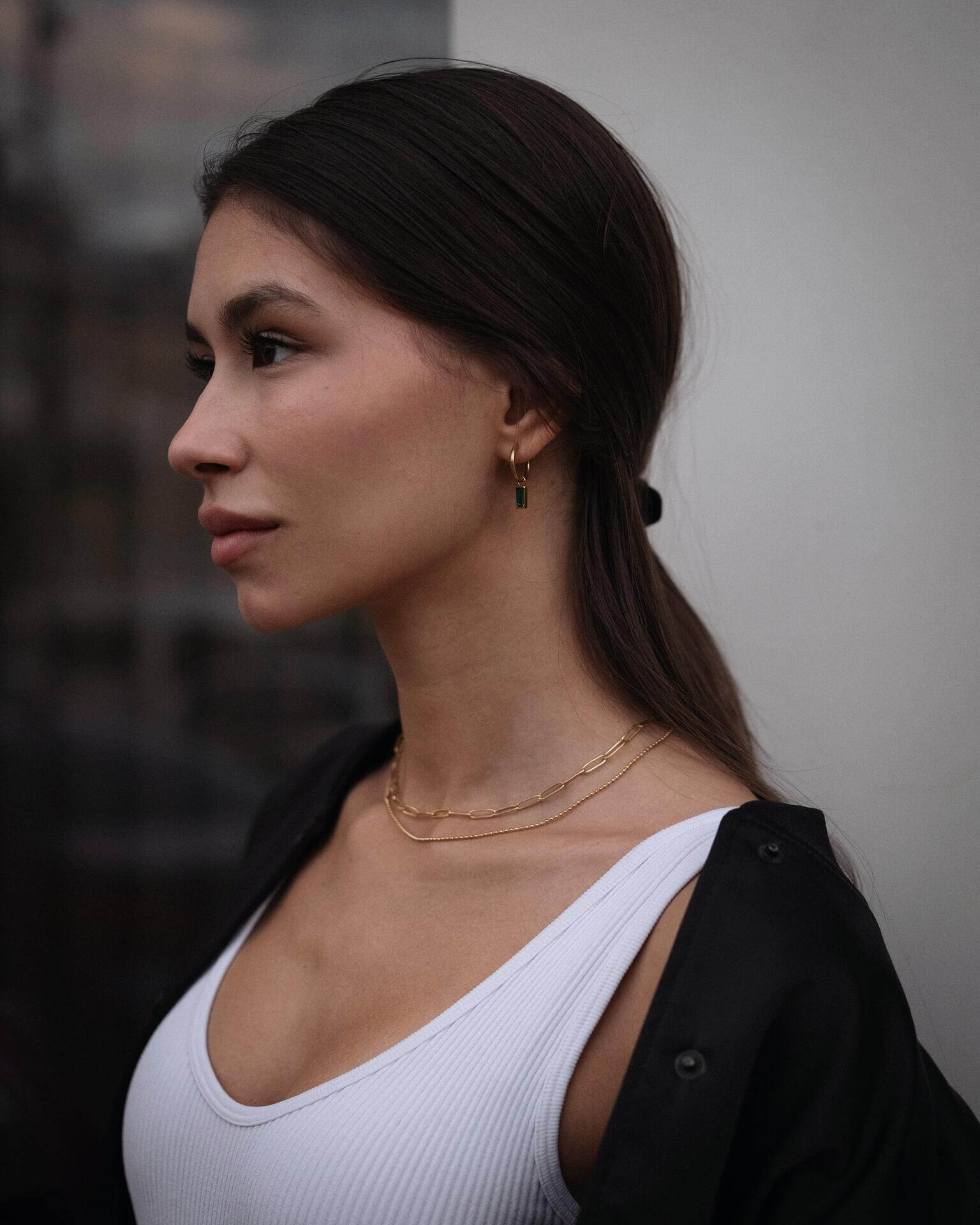 Млада жена с двойно златисто колие и обеци, подчертаваща елегантен стил на фона на неясен градски пейзаж.