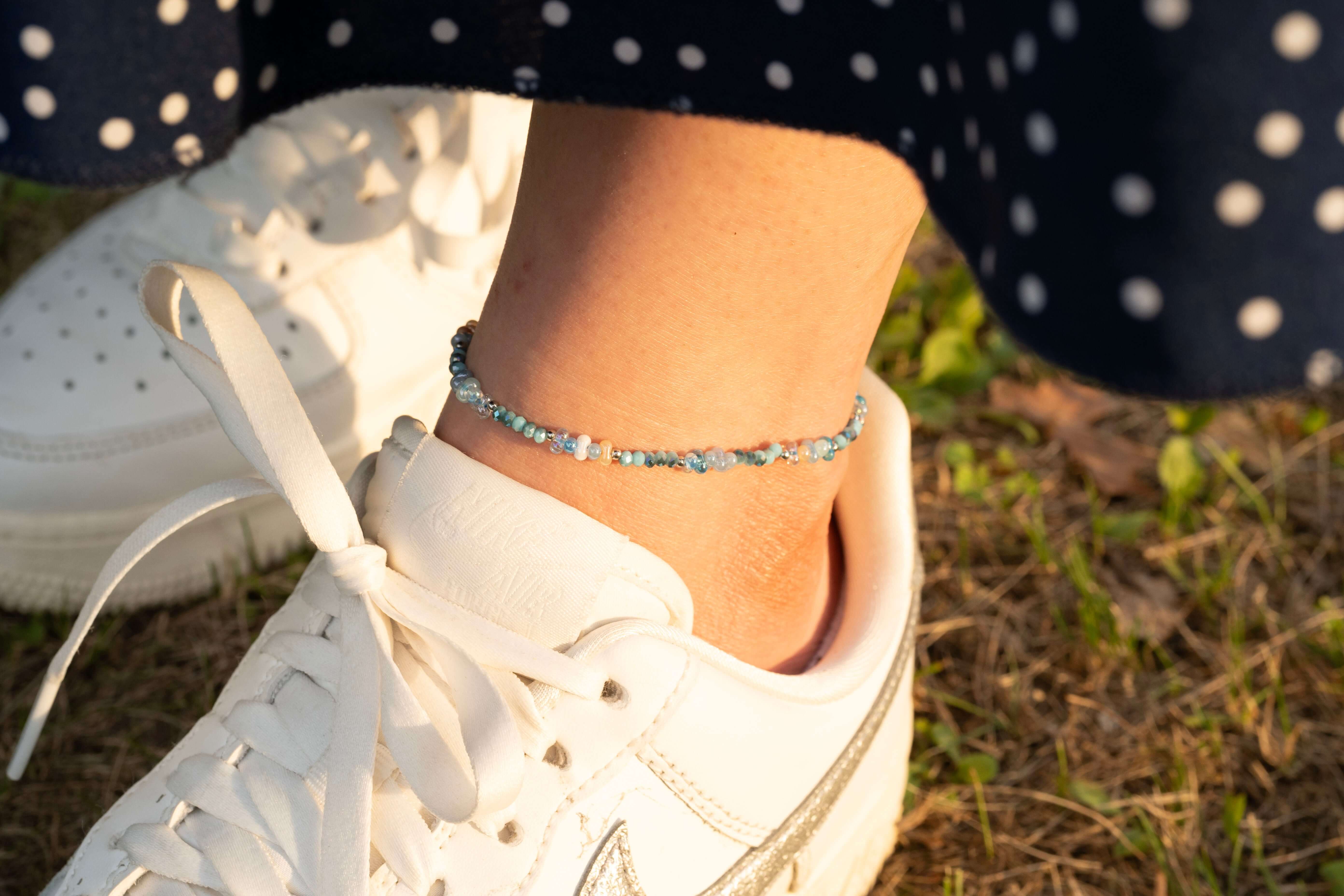 Гривна за глезен с цветни мъниста в синьо и бяло, ръчно изработена с регулируемо закопчаване.