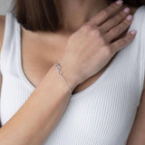 Сребърна гривна с форма на сърца, модел S925, носена от жена с изправена коса.