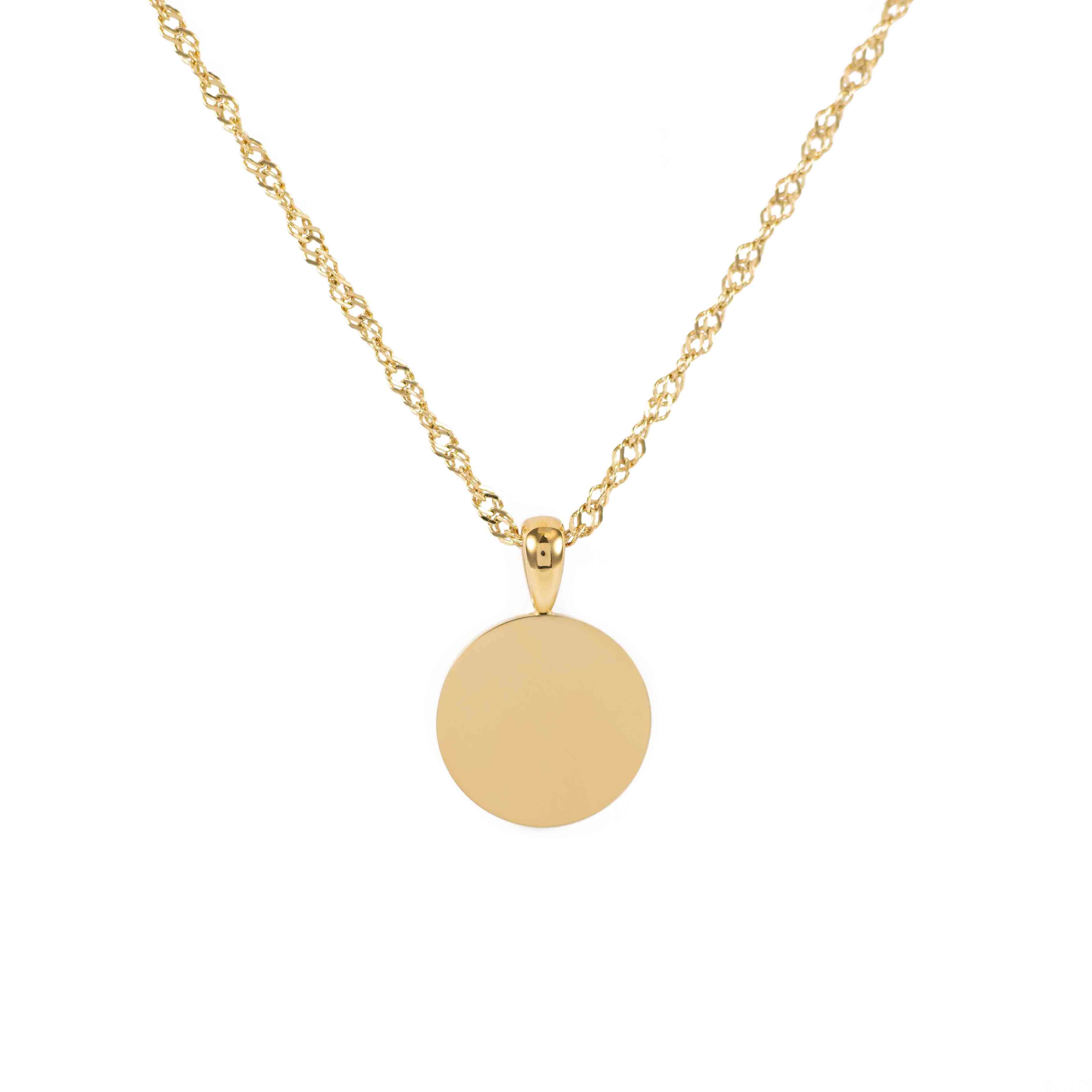 Колието „Златен Кръг“ – Персонализирано с Гравиране е създадено за специални моменти и уникални послания. Нежната верижка с фина позлата държи изчистен, кръгъл медальон с огледално гладка повърхност – идеално платно за Вашето лично послание.