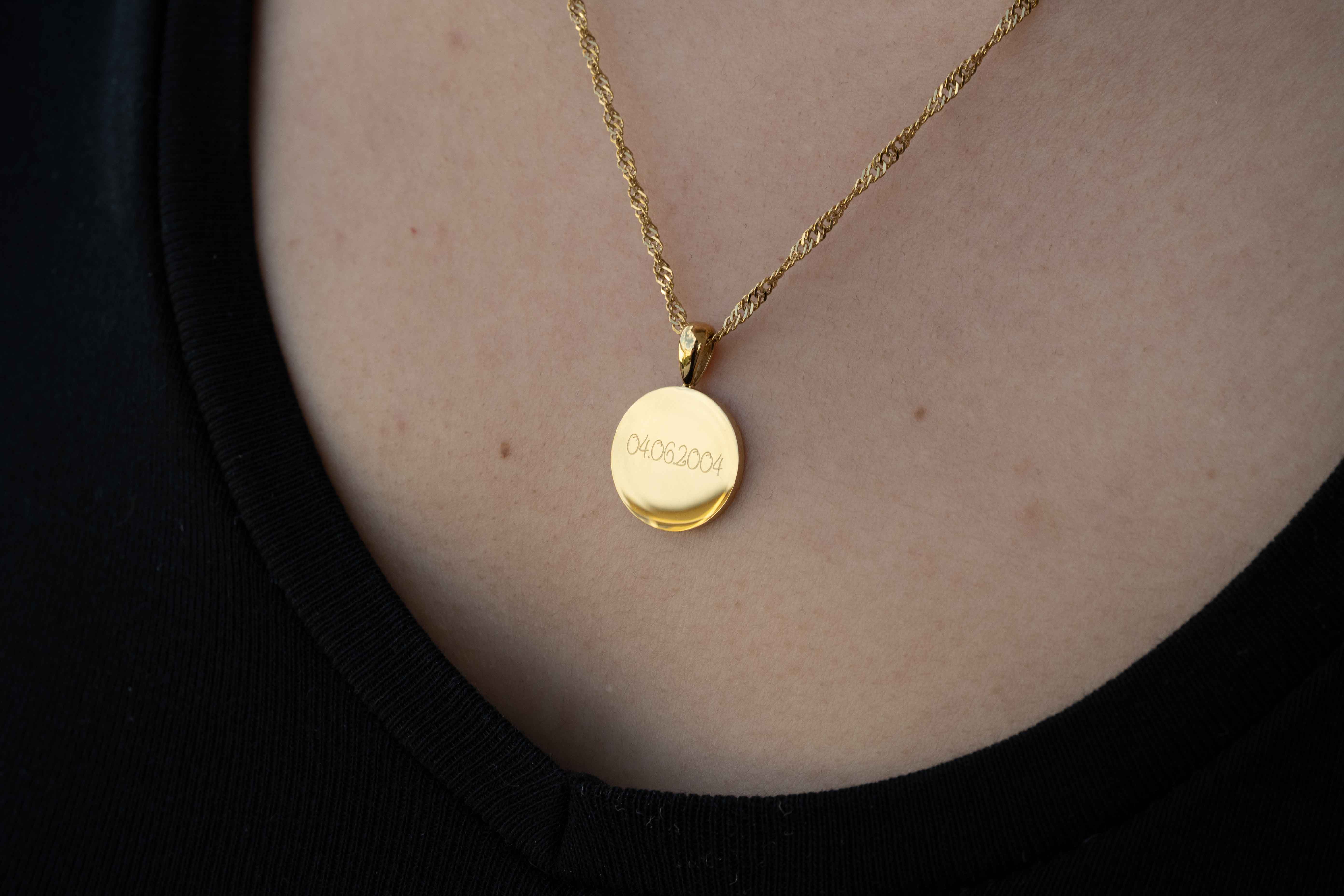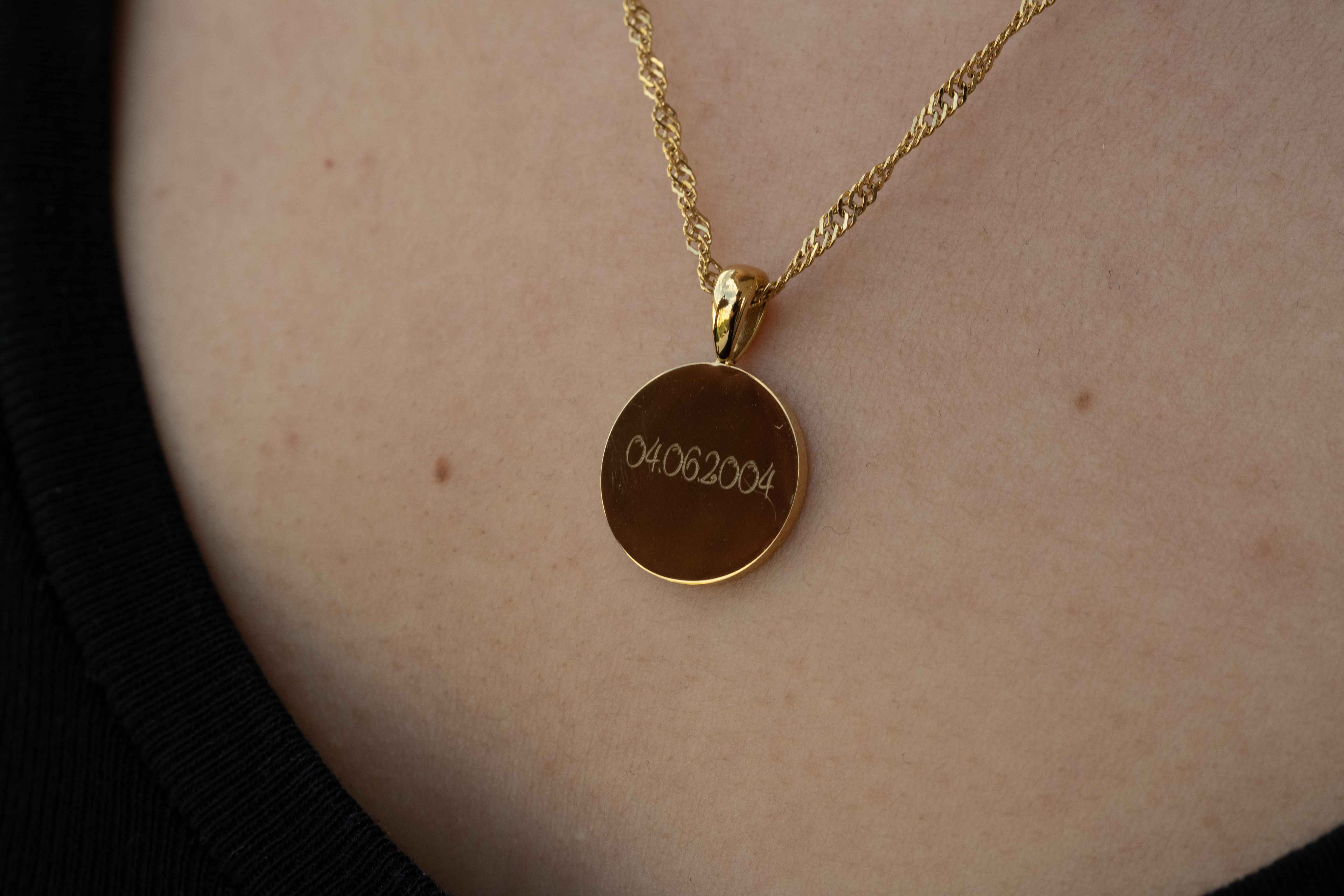 Колието Златен Кръг с 18К Позлата – Персонализирано с Гравиране, медальон с гравиране на дата, нежна златна верижка.