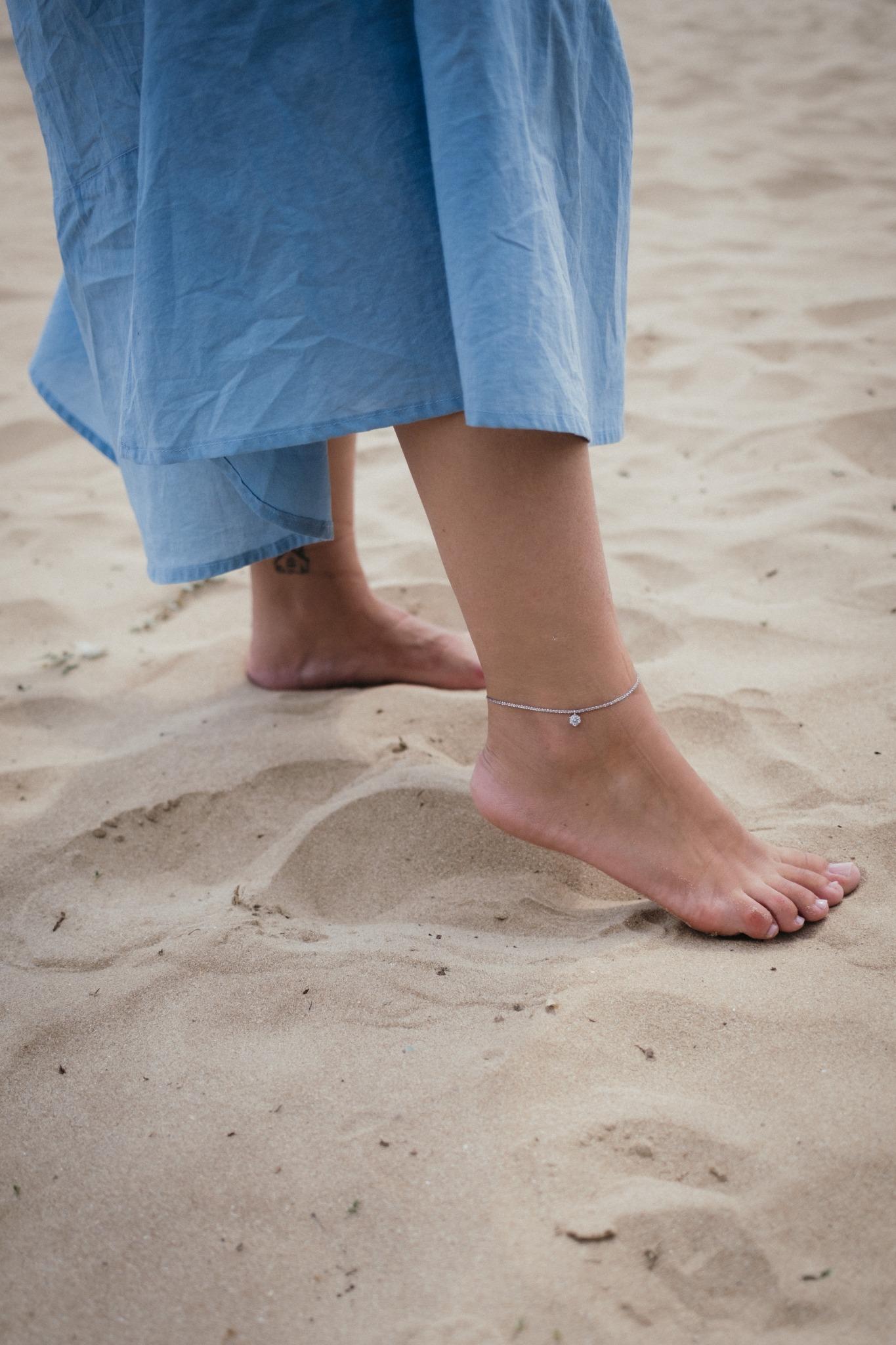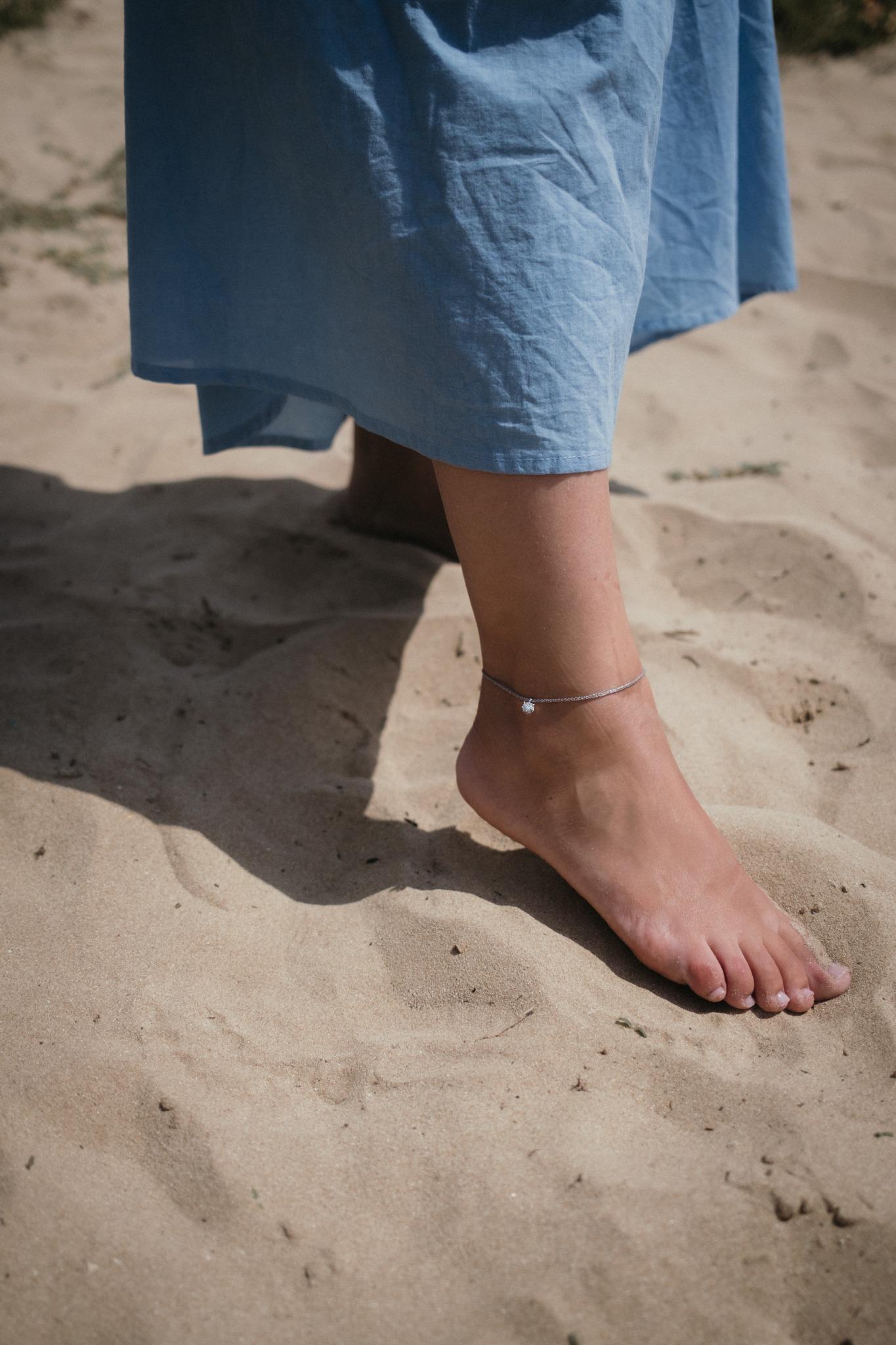 Сребърна Гривна за Глезен Блясък S925 на крак по време на разходка по пясък