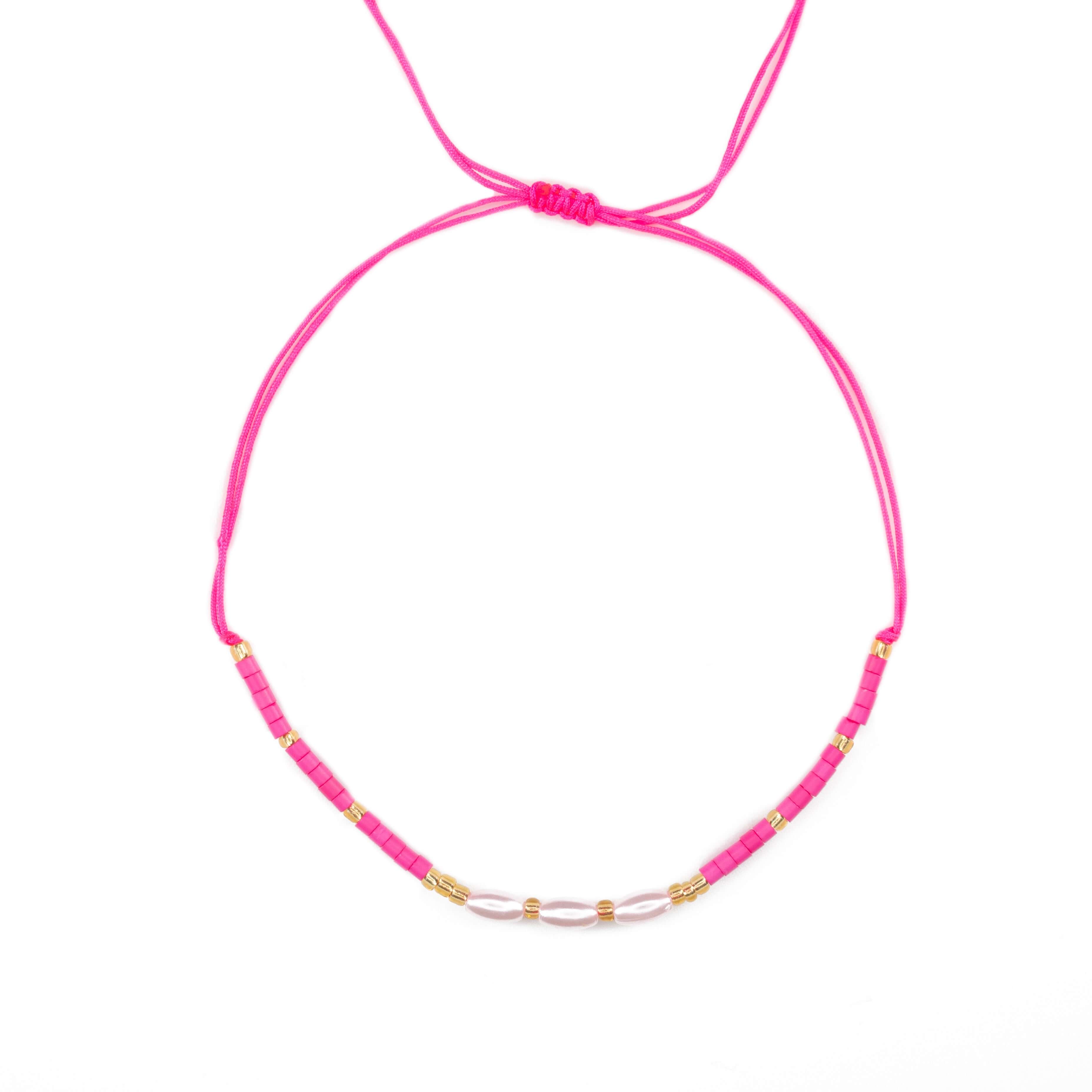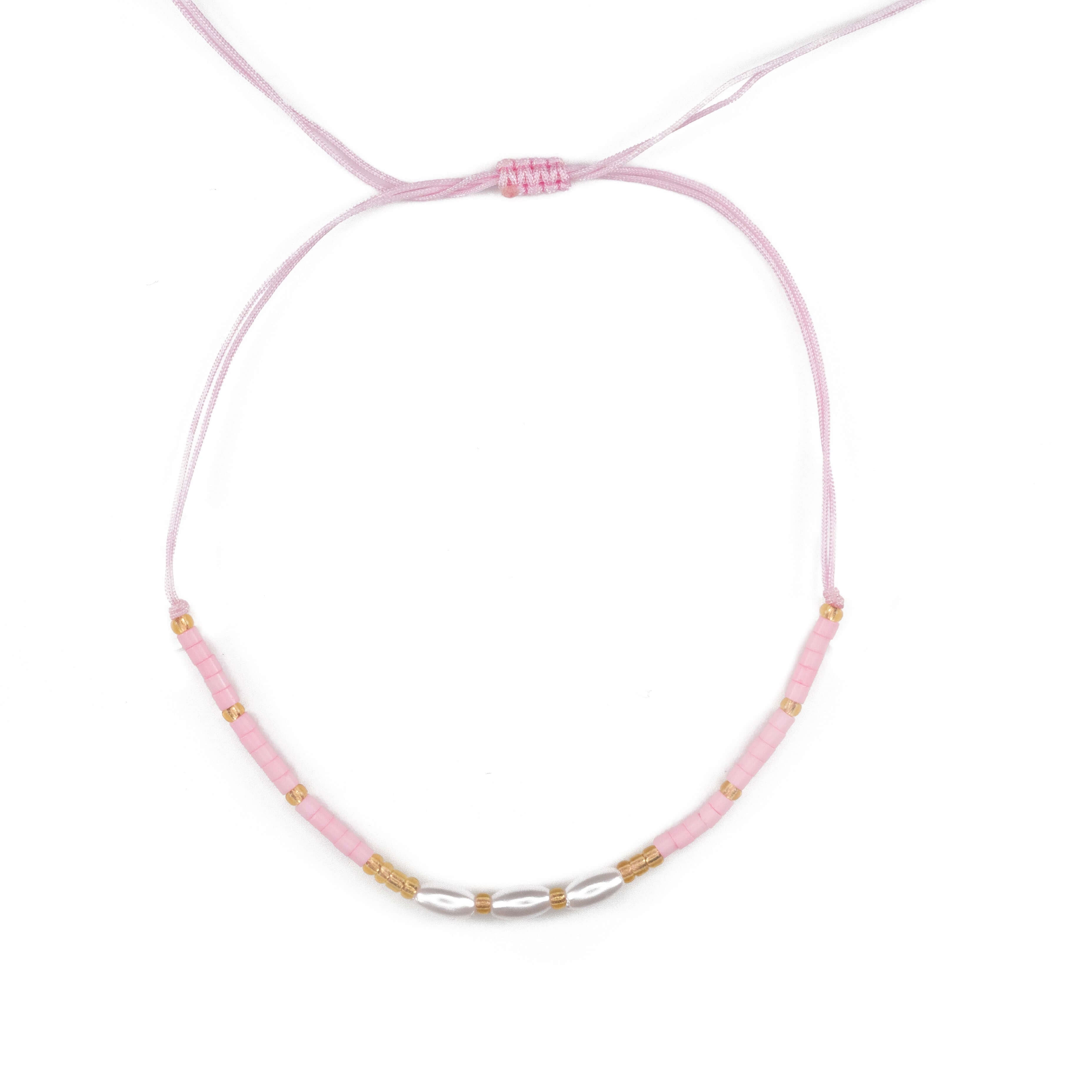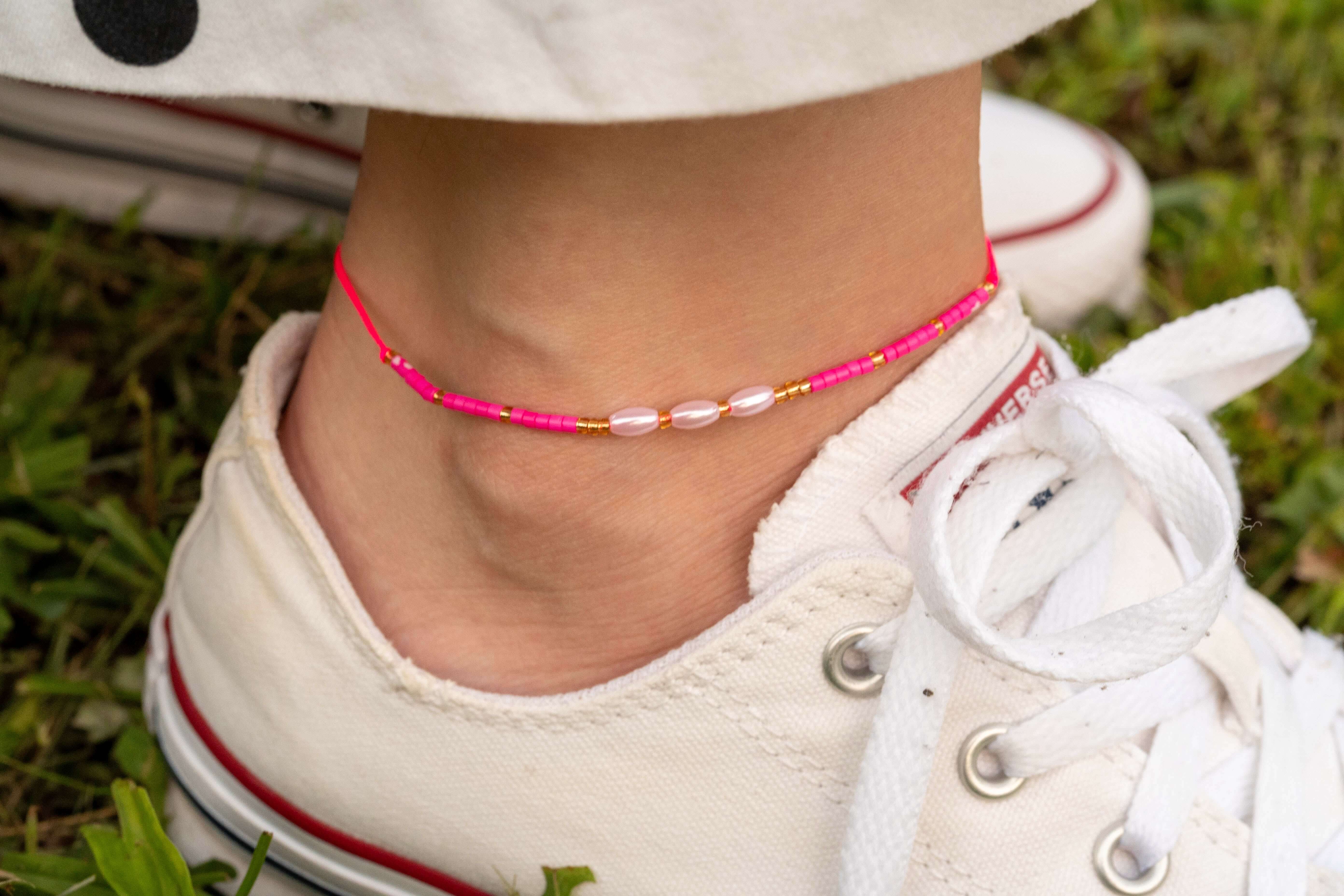 Бохо гривна за глезен в розово с мъниста и фини детайли, ръчно изработена и регулируема.