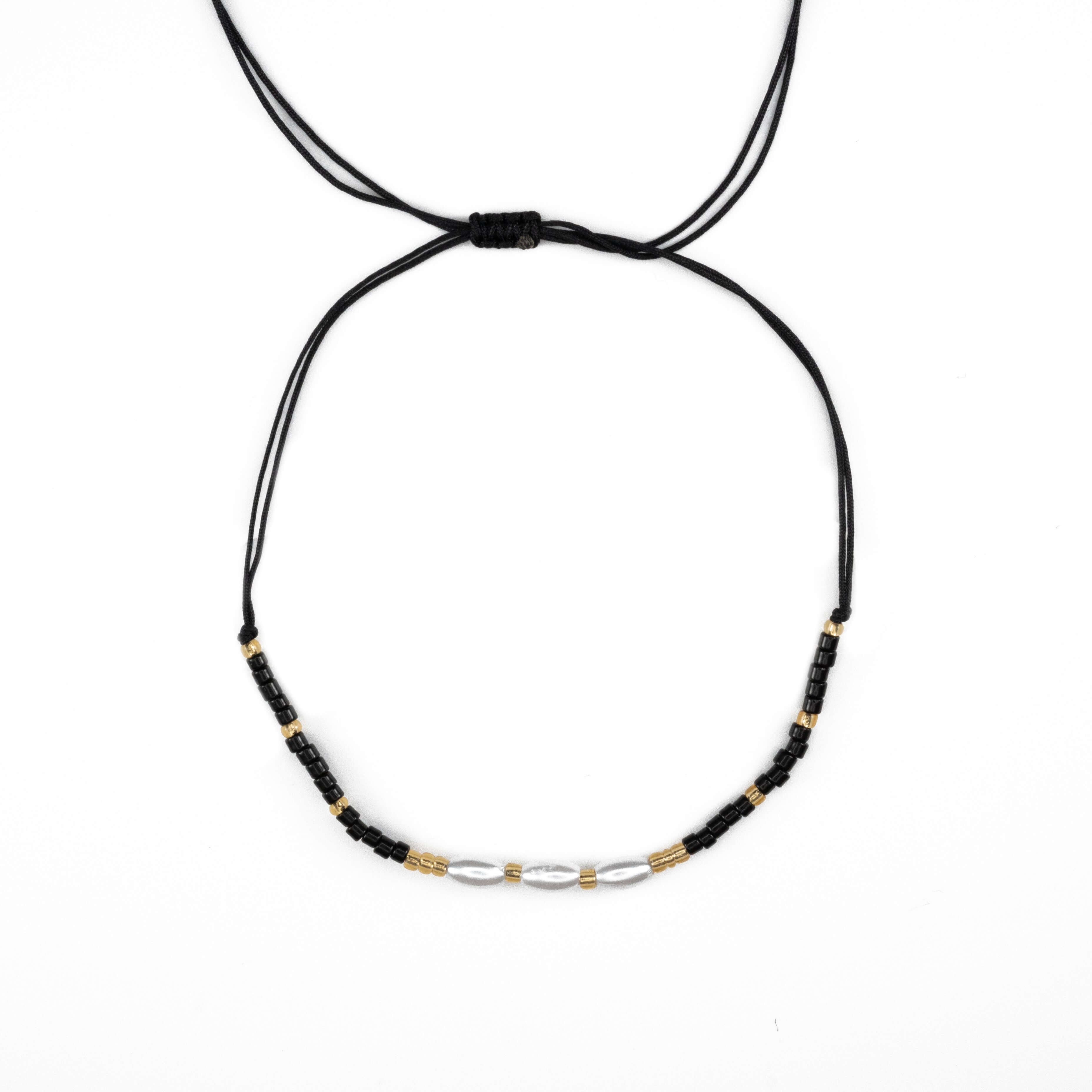Ръчно изработена гривна с черен конец и перли, елегантен акцента за бохо стил.