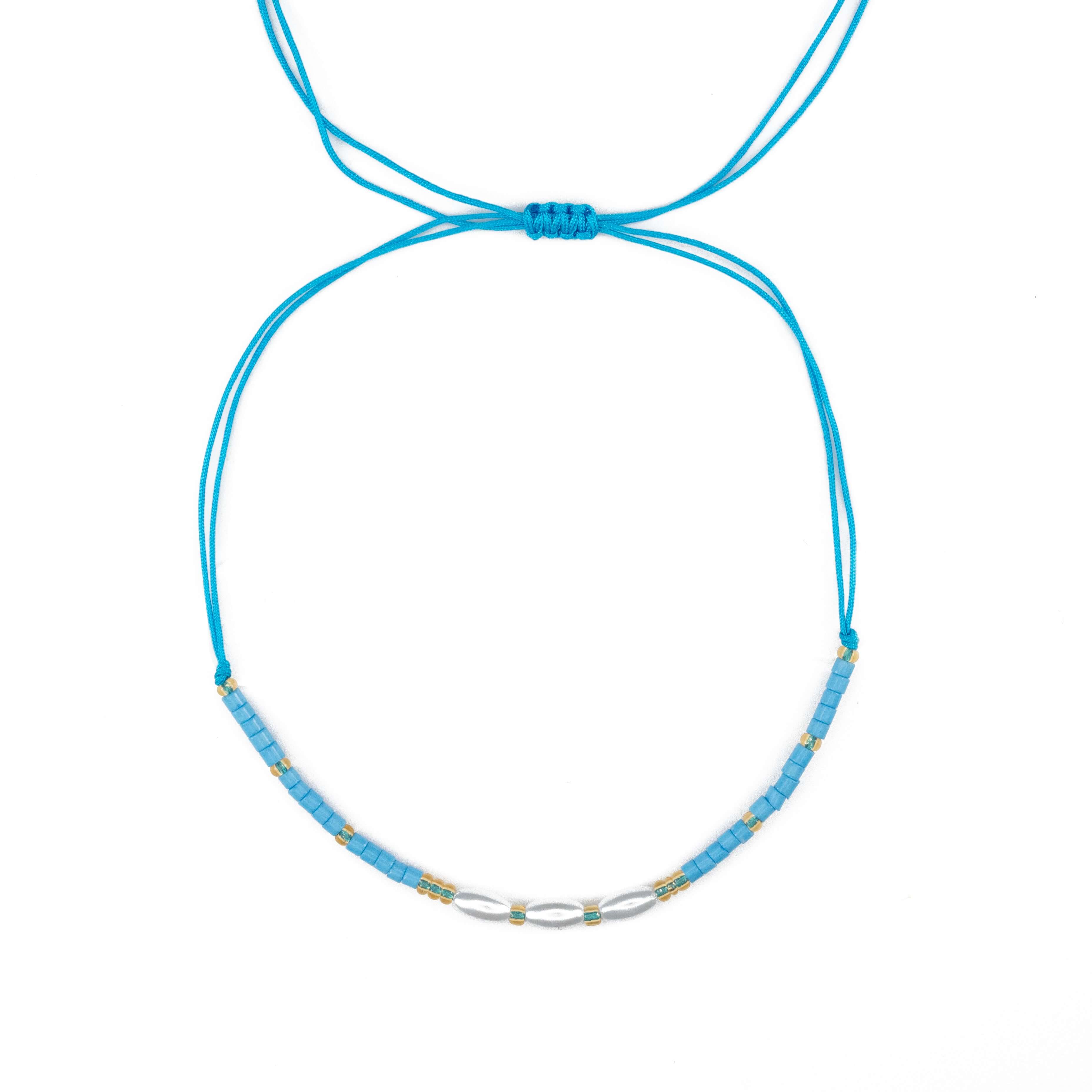 Бохо гривна за глезен с нежни мъниста в синьо и златисти акценти, регулируема и стилна.