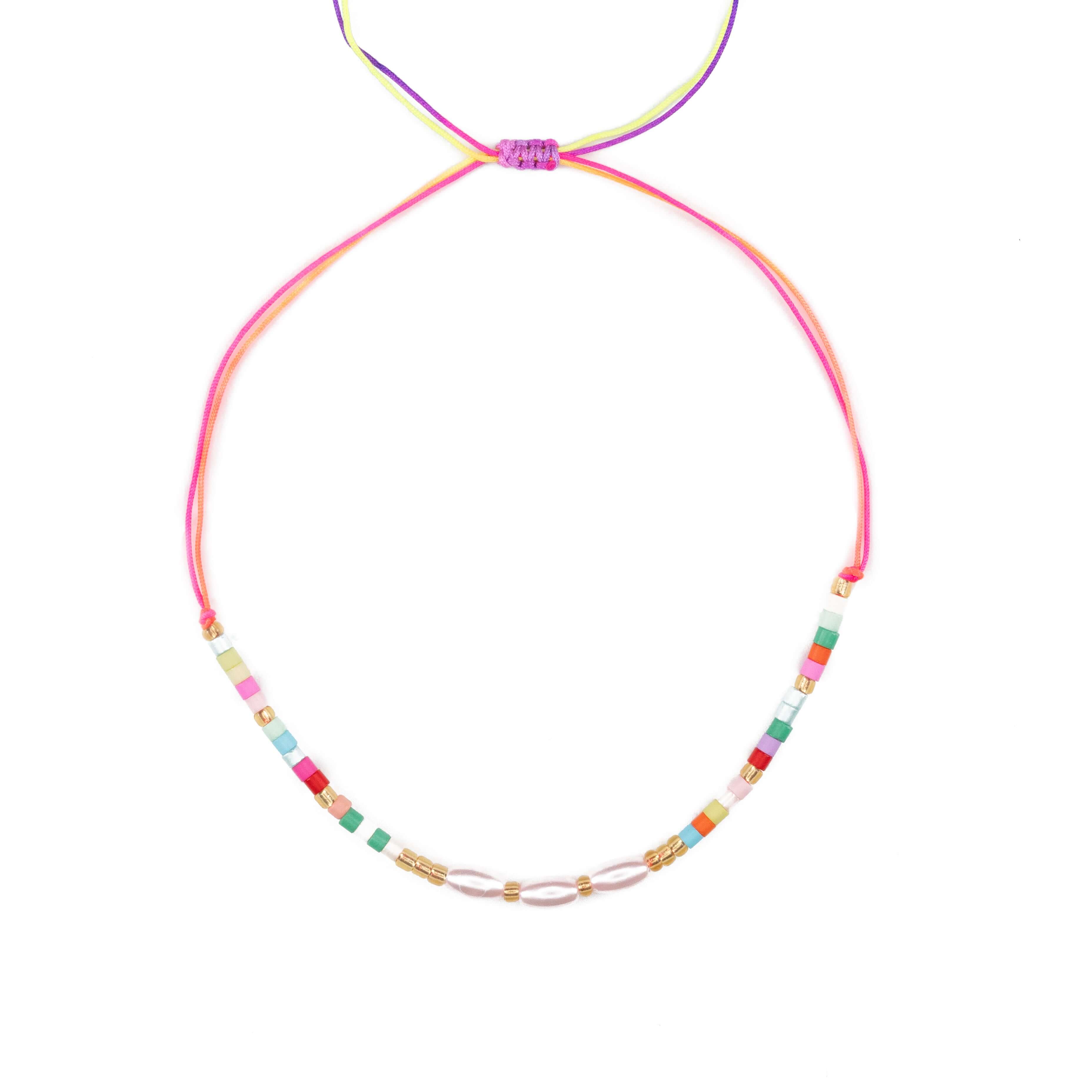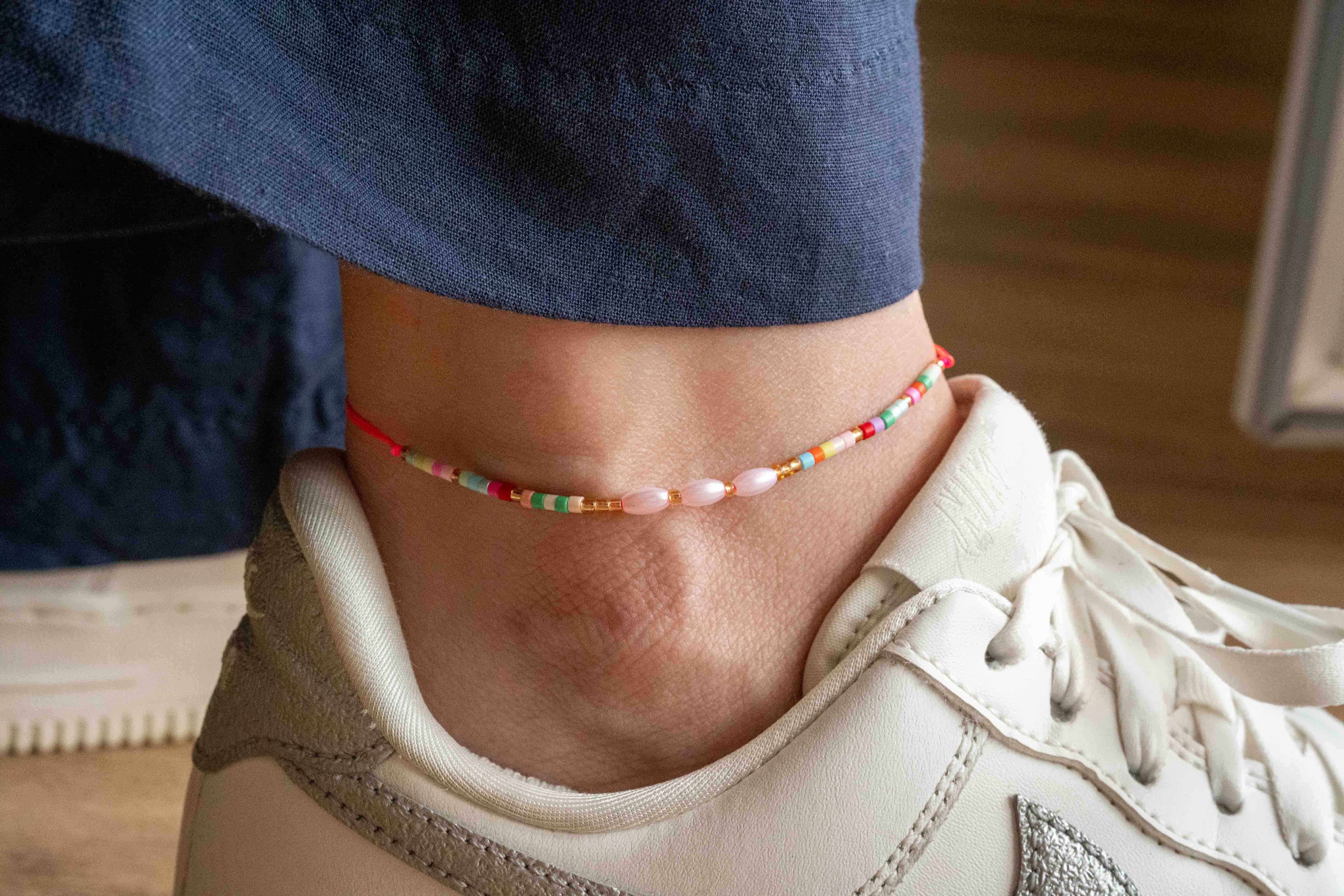 Бохо гривна за глезен с цветни мъниста и перли, ръчно изработена, регулируема и ефирна.