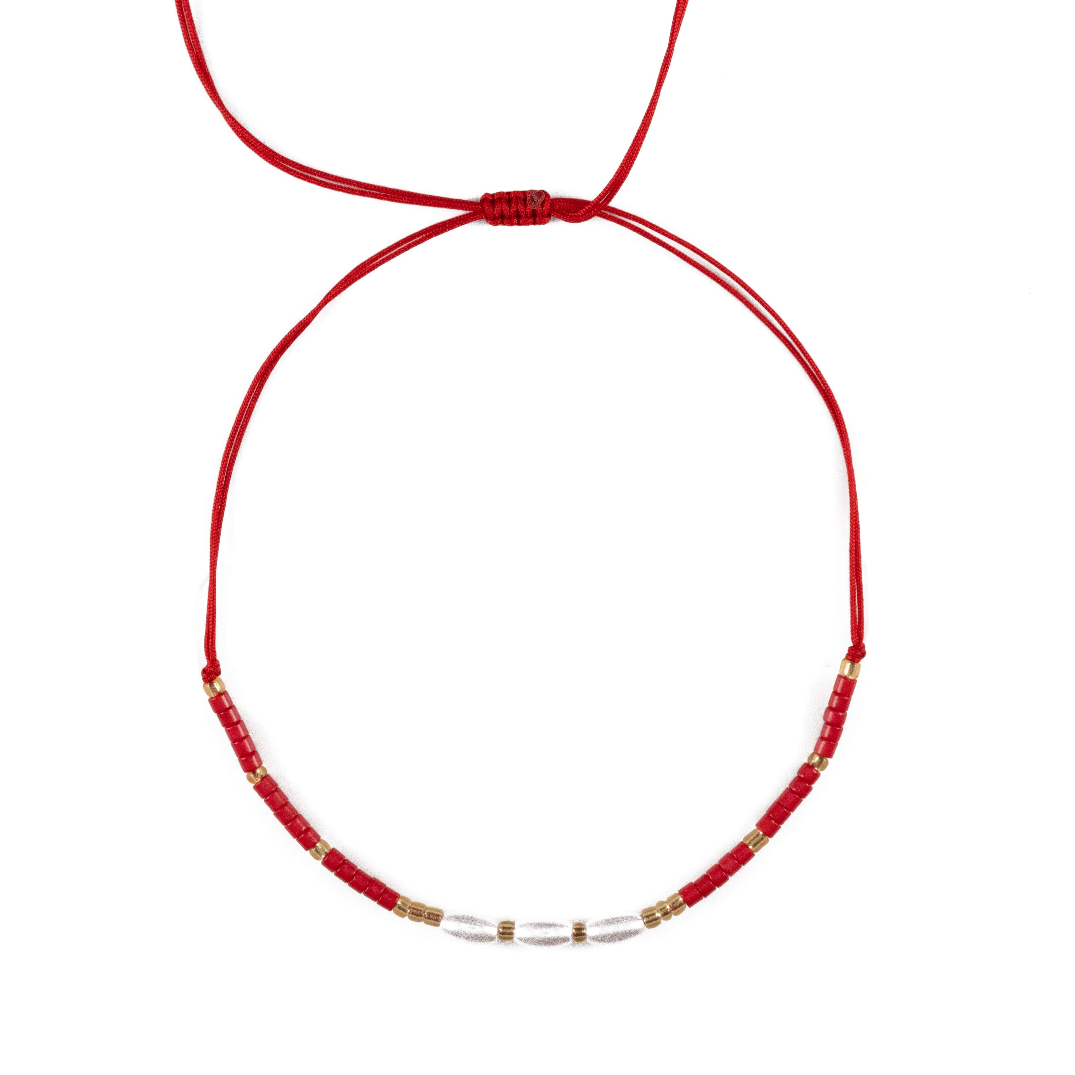 Елегантна бохо гривна за глезен с червен конец и нежни перли, регулируема и стилна