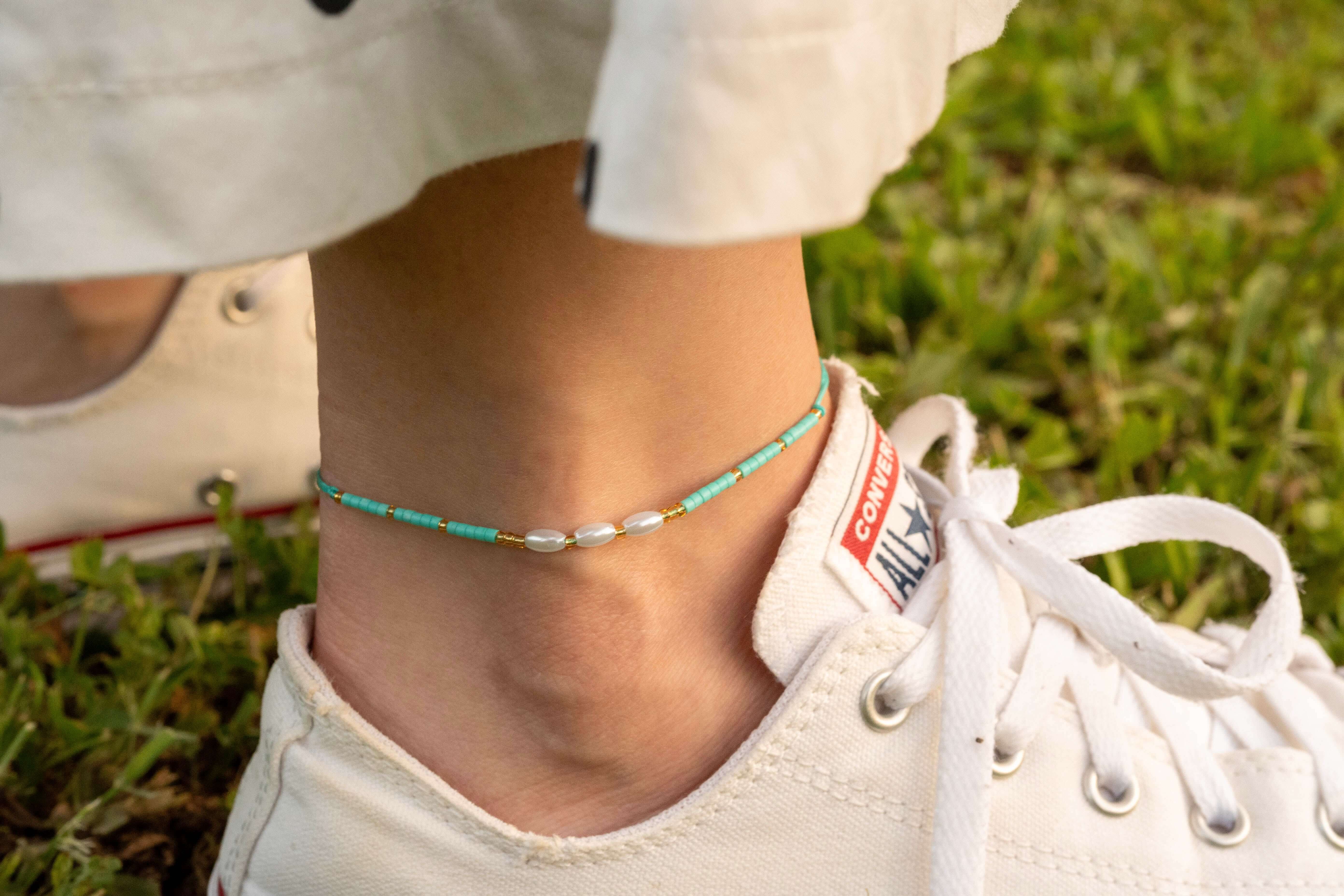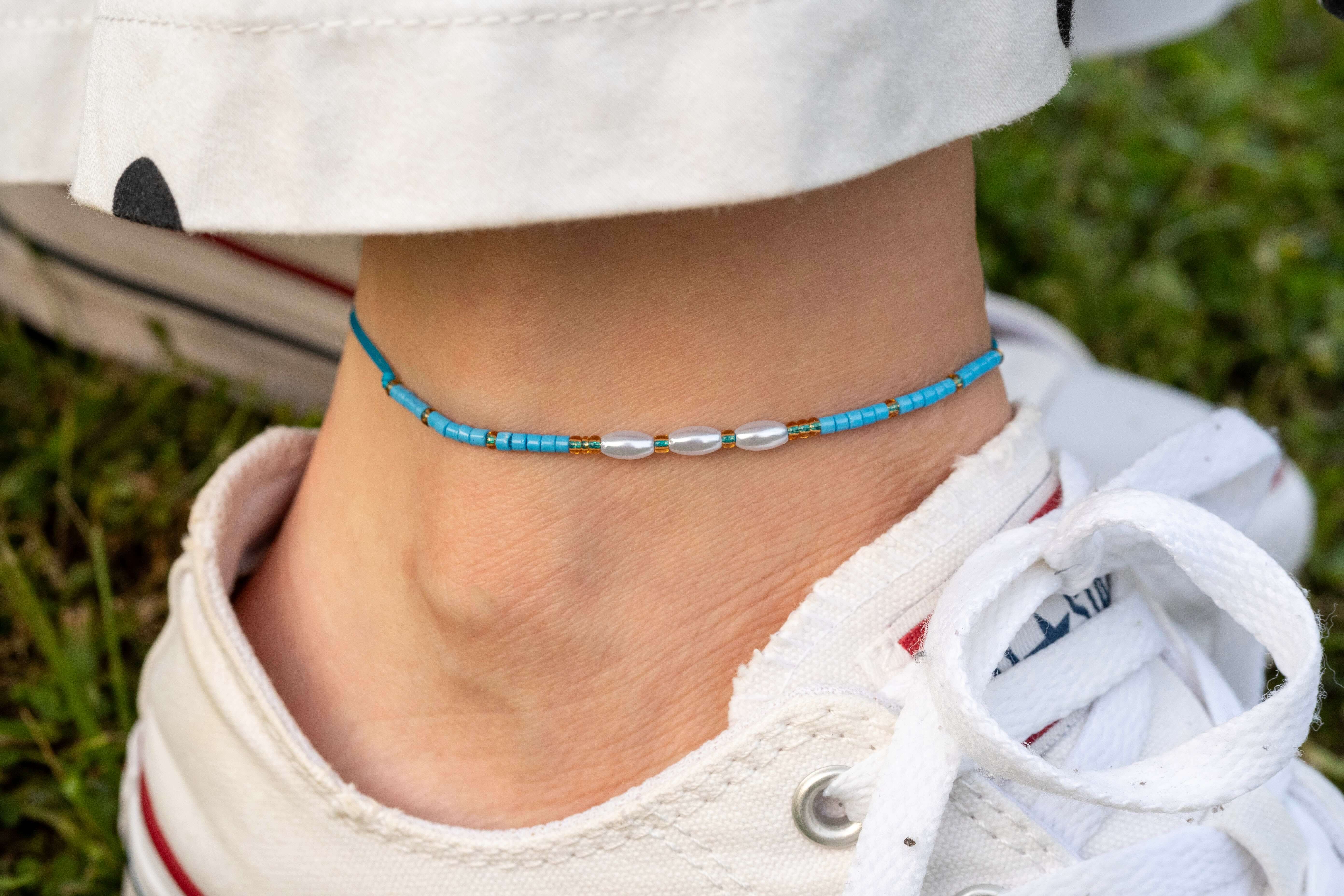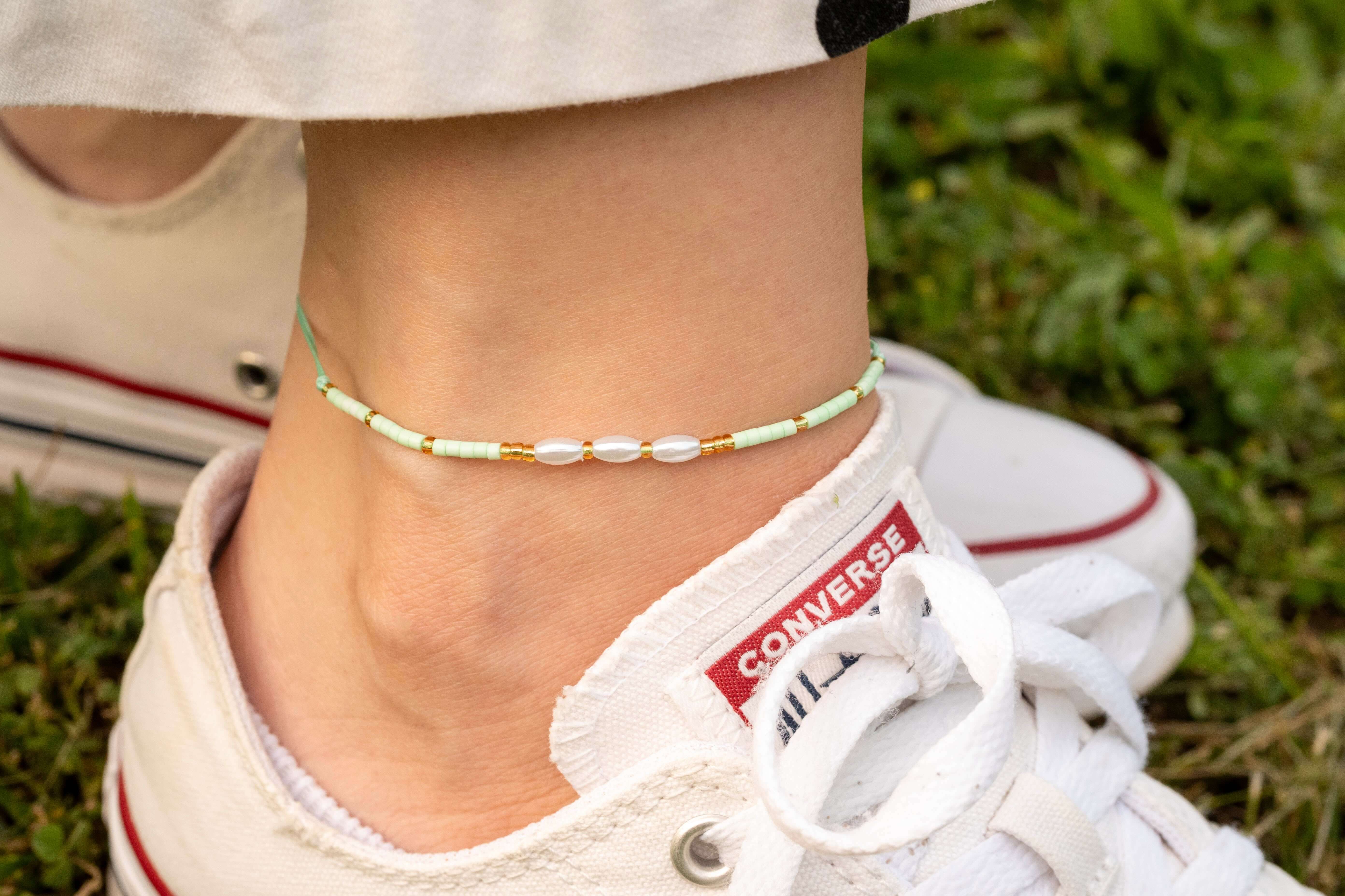 Ръчно изработена бохо гривна за глезен с перлички и мъниста, носена на гол крак с бели обувки.