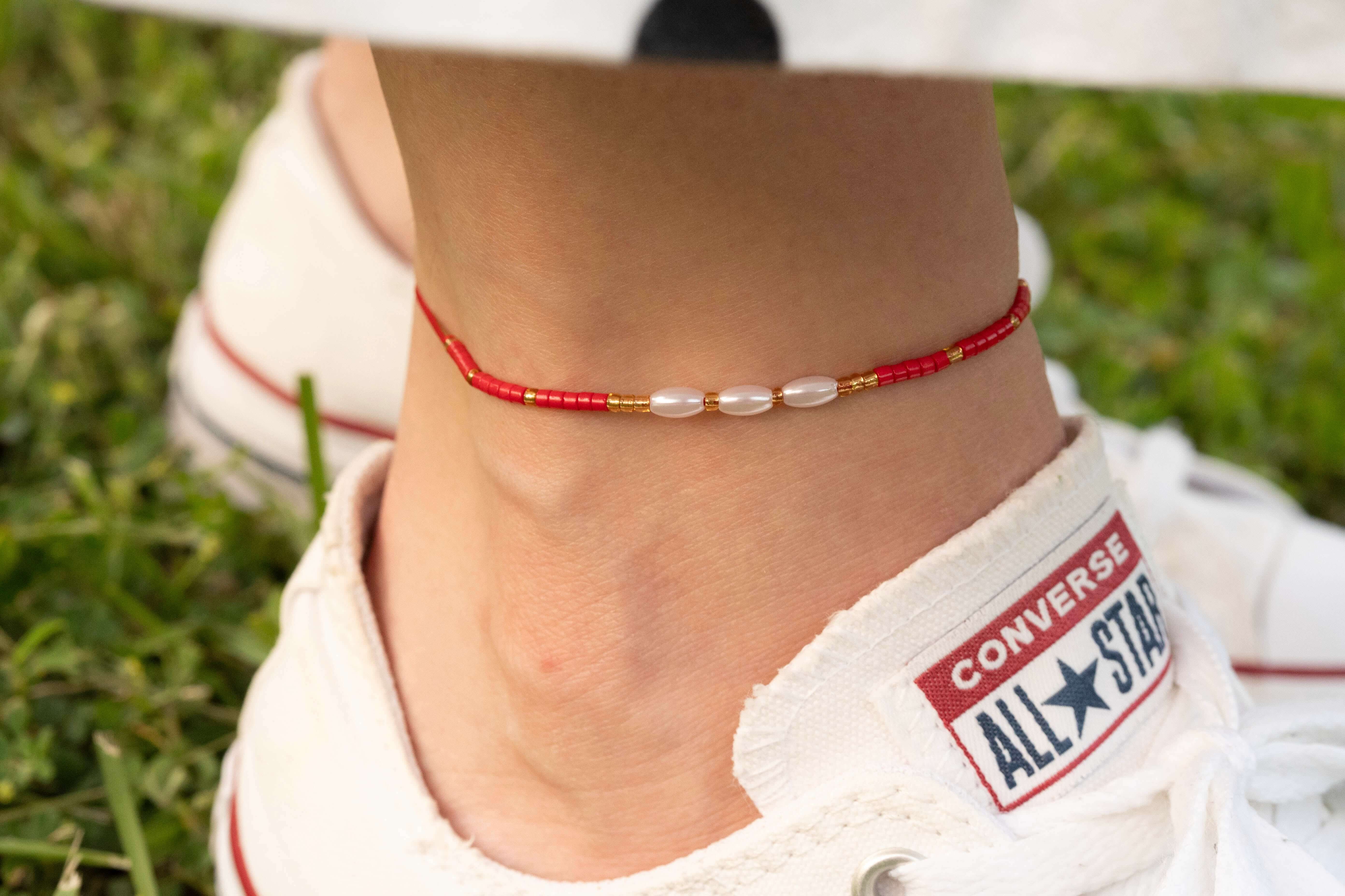 Бохо гривна за глезен от червен конец с перлички, носена с удобни маратонки на зелен фон.