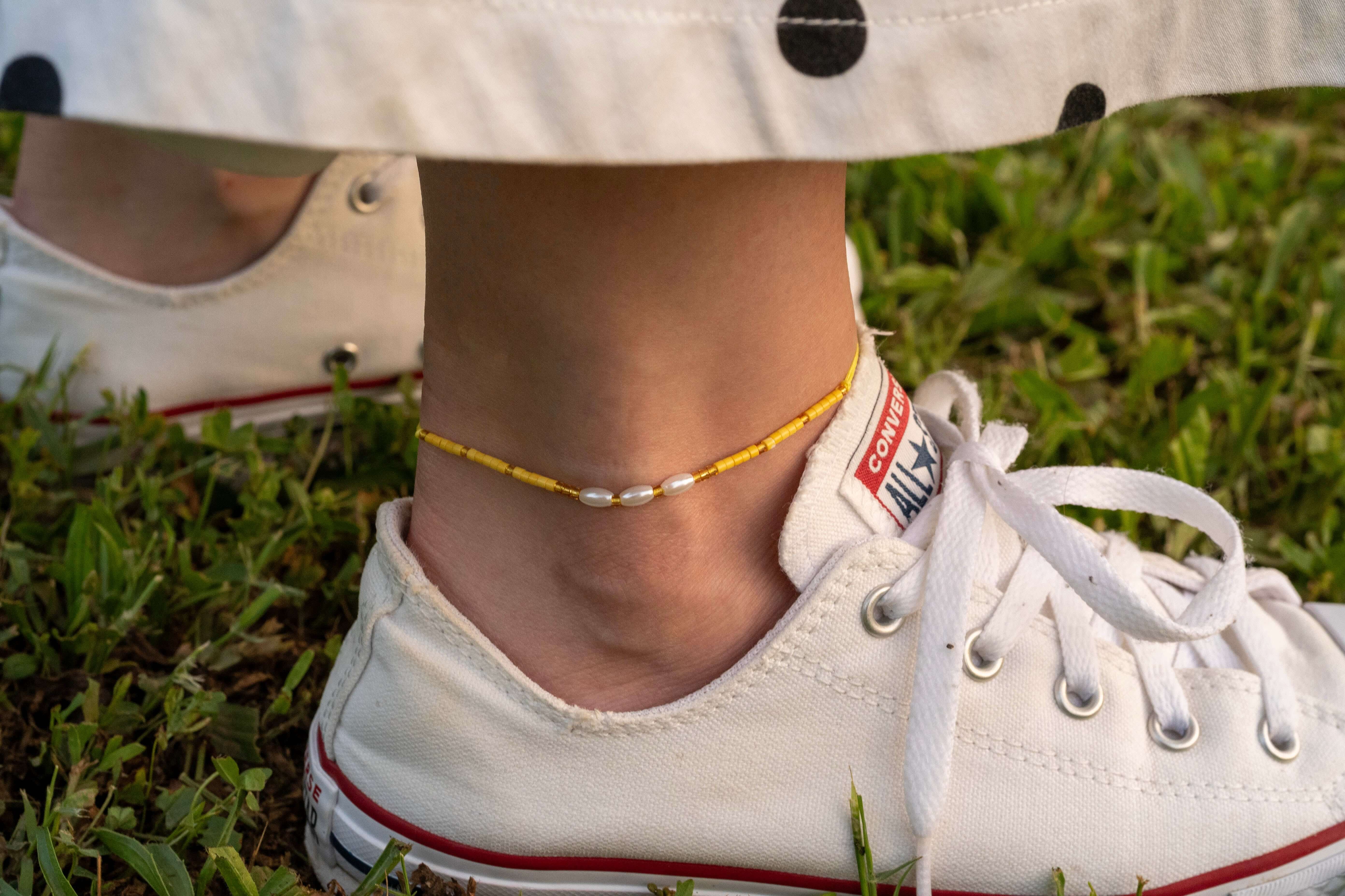 Бохо гривна за глезен с жълти мъниста и перли, носена с бели кеди на зелена трева.