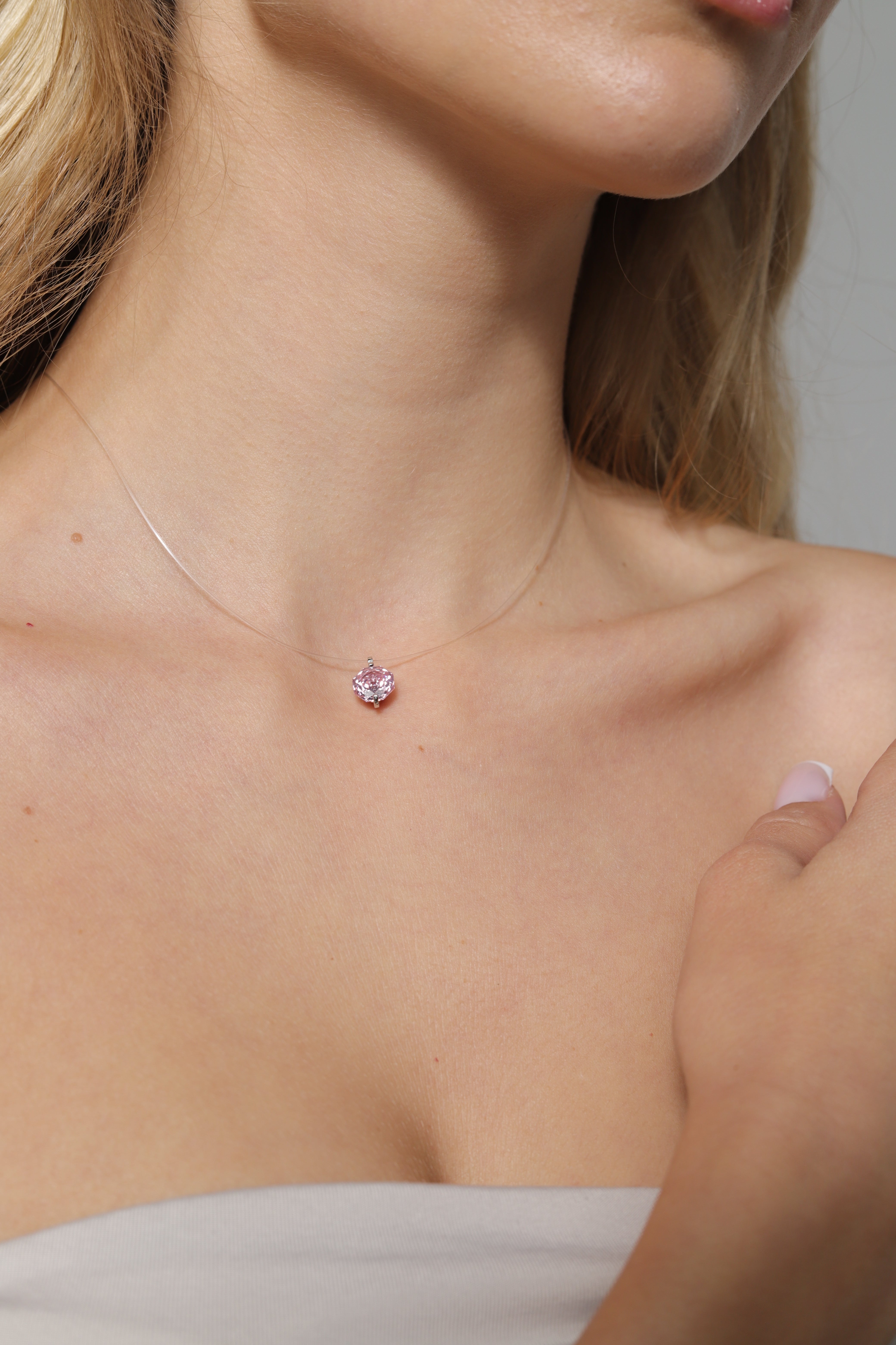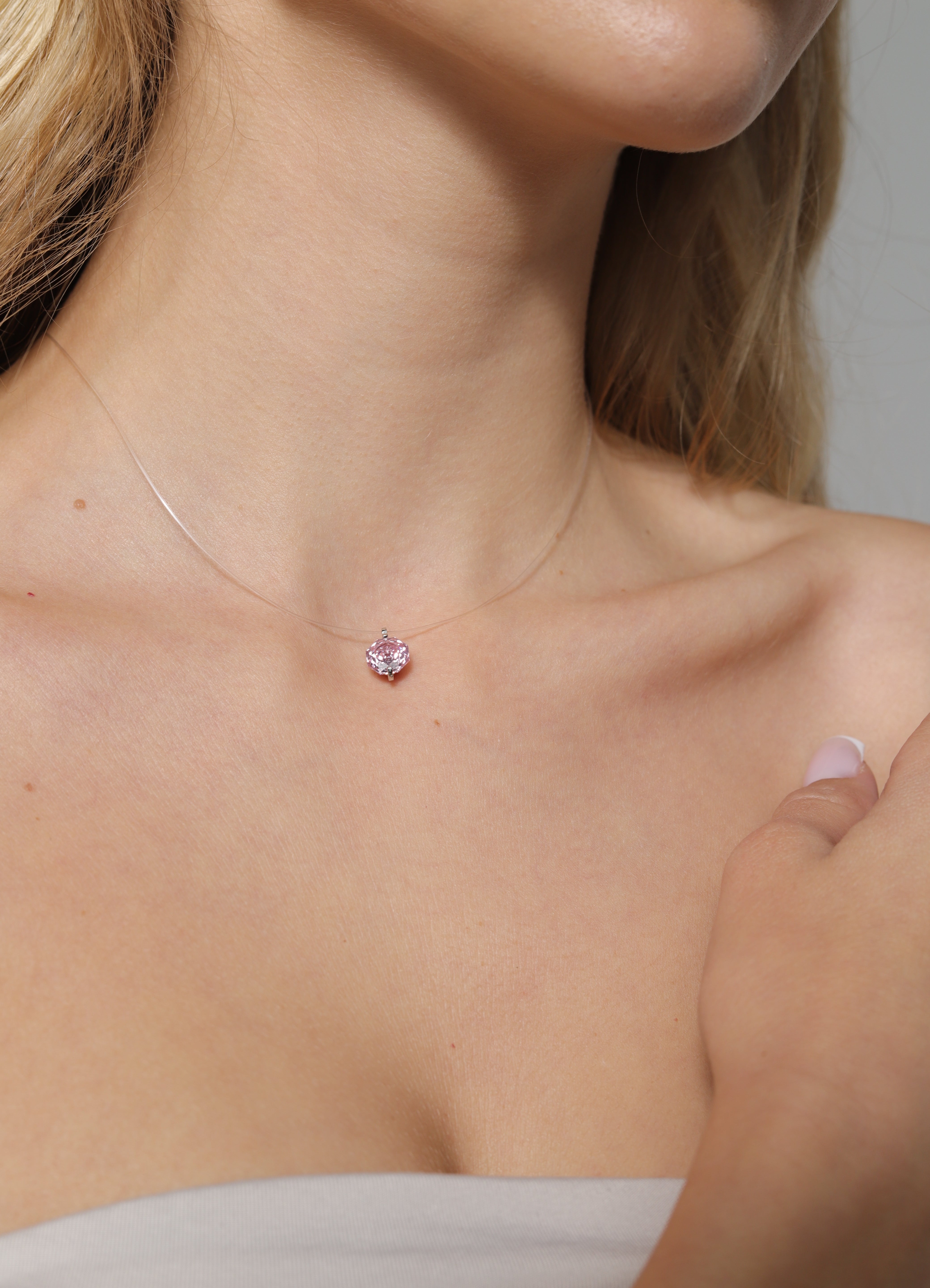Сребърно колие с циркон на фона на жена в светло синя риза, акцентиращо на елегантност и стил.