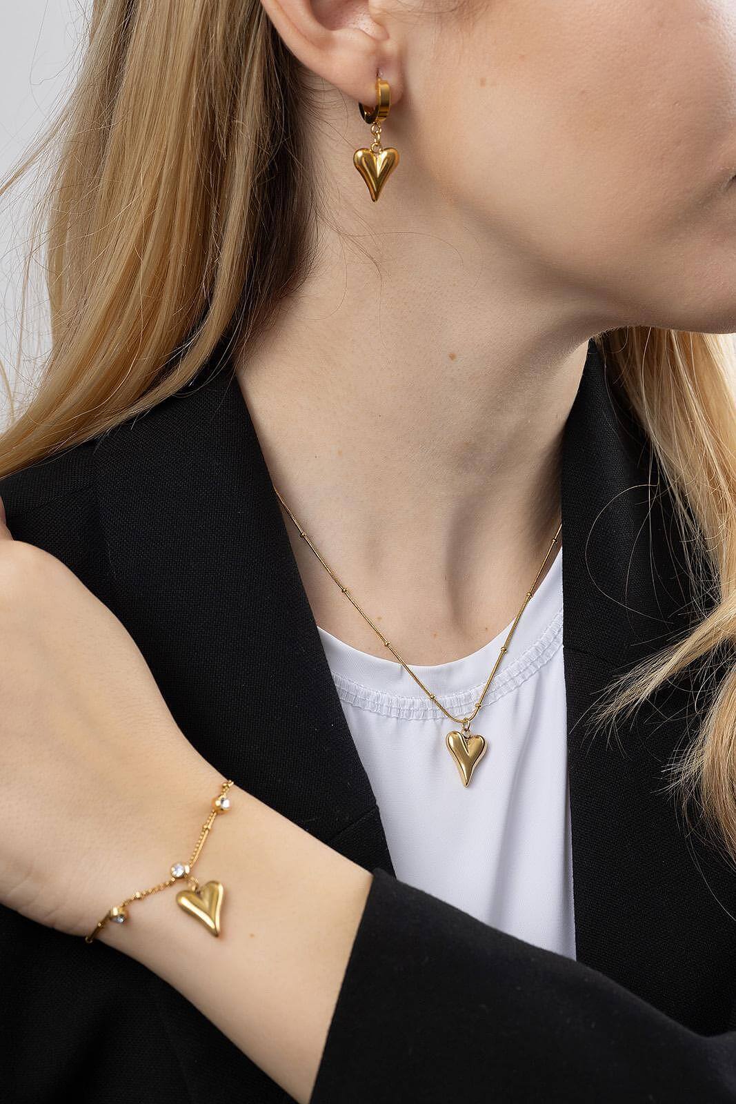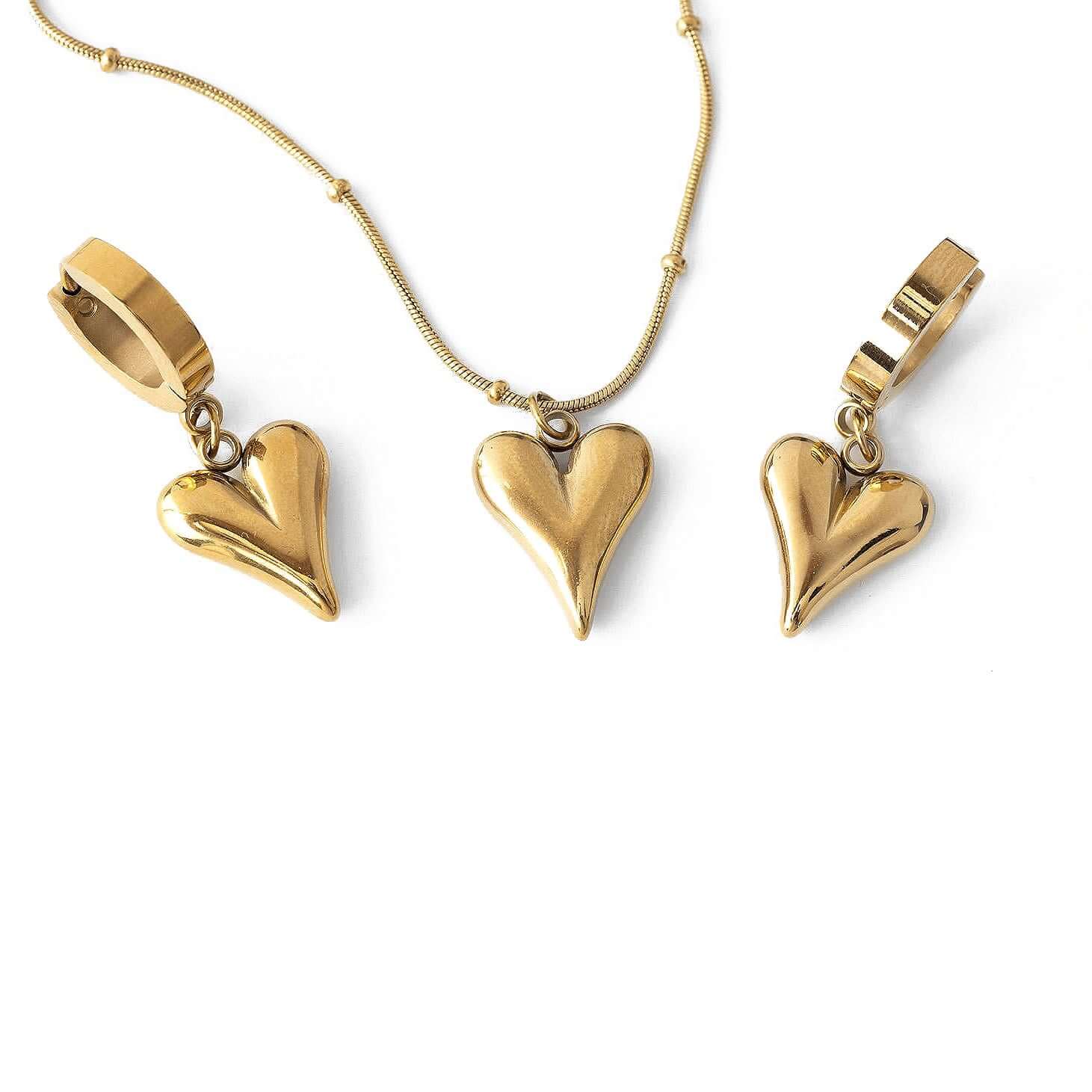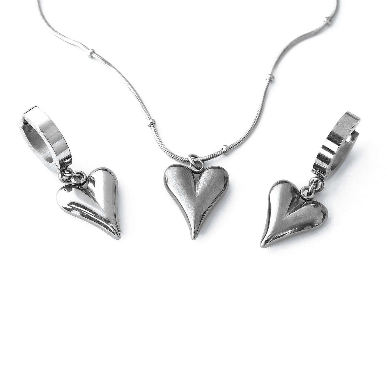 Комплект колие и обеци от медицинска стомана с висулки във формата на сърце, идеален за романтични визии.