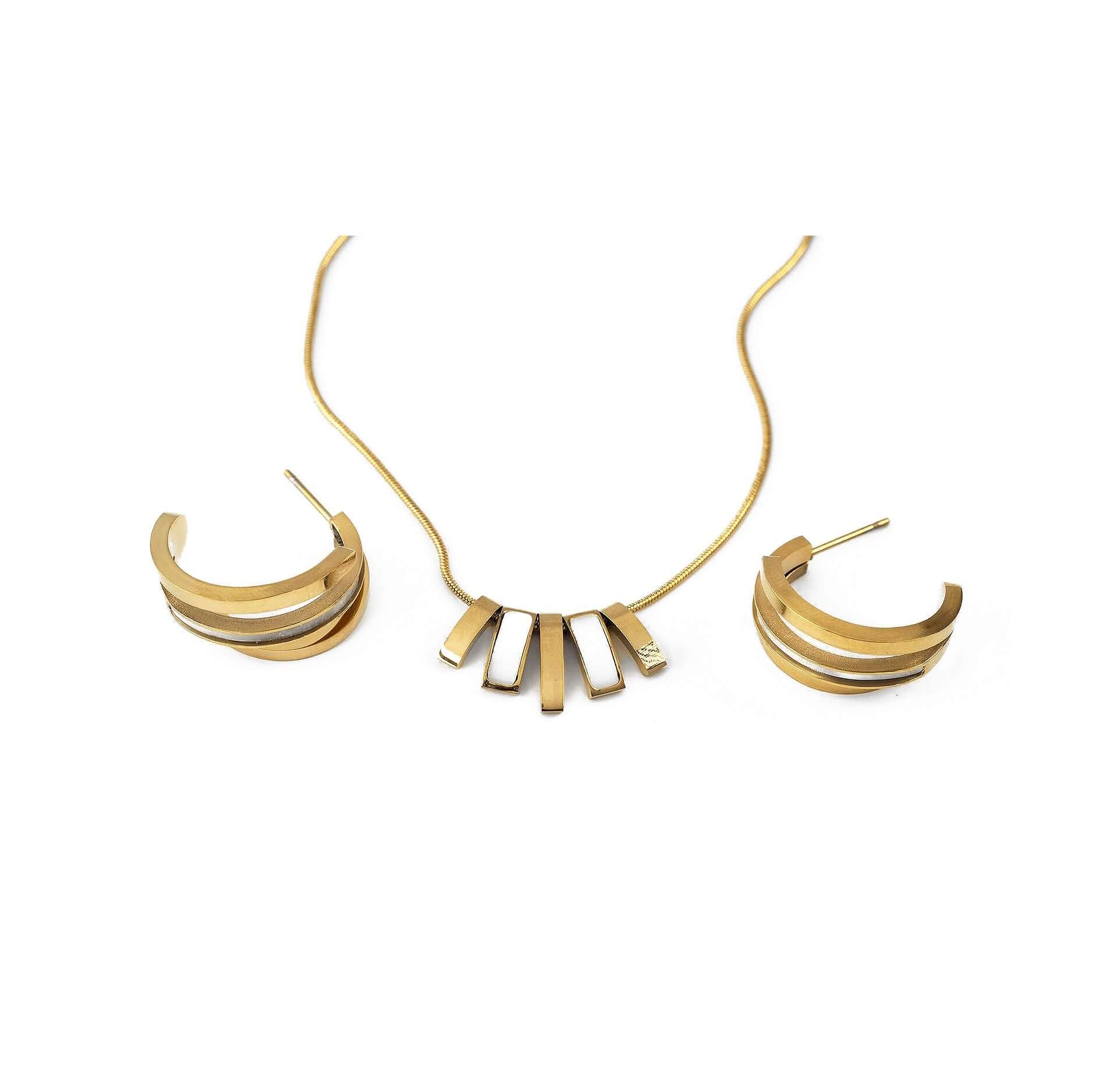 Златист комплект обеци и колие от медицинска стомана и седеф, носени от жена с дълга коса.