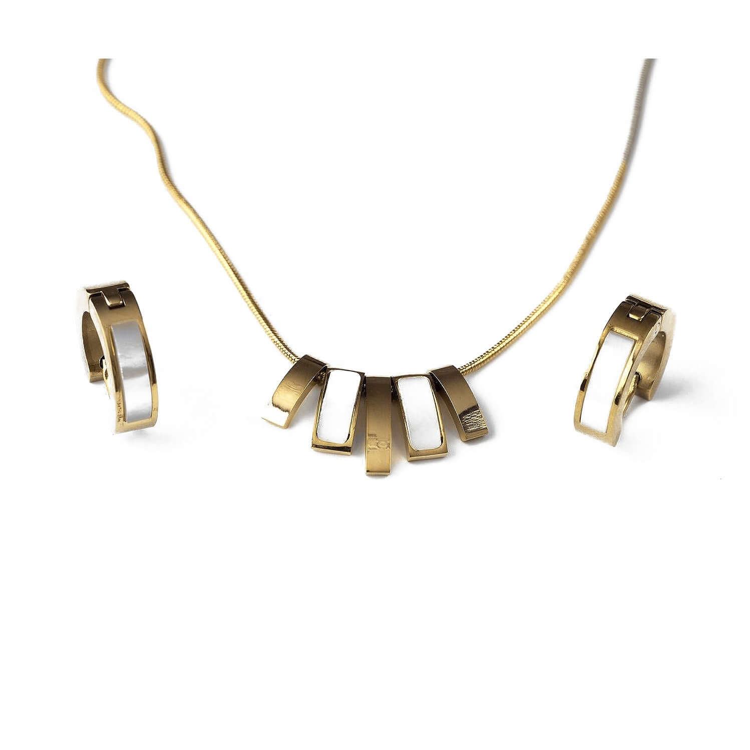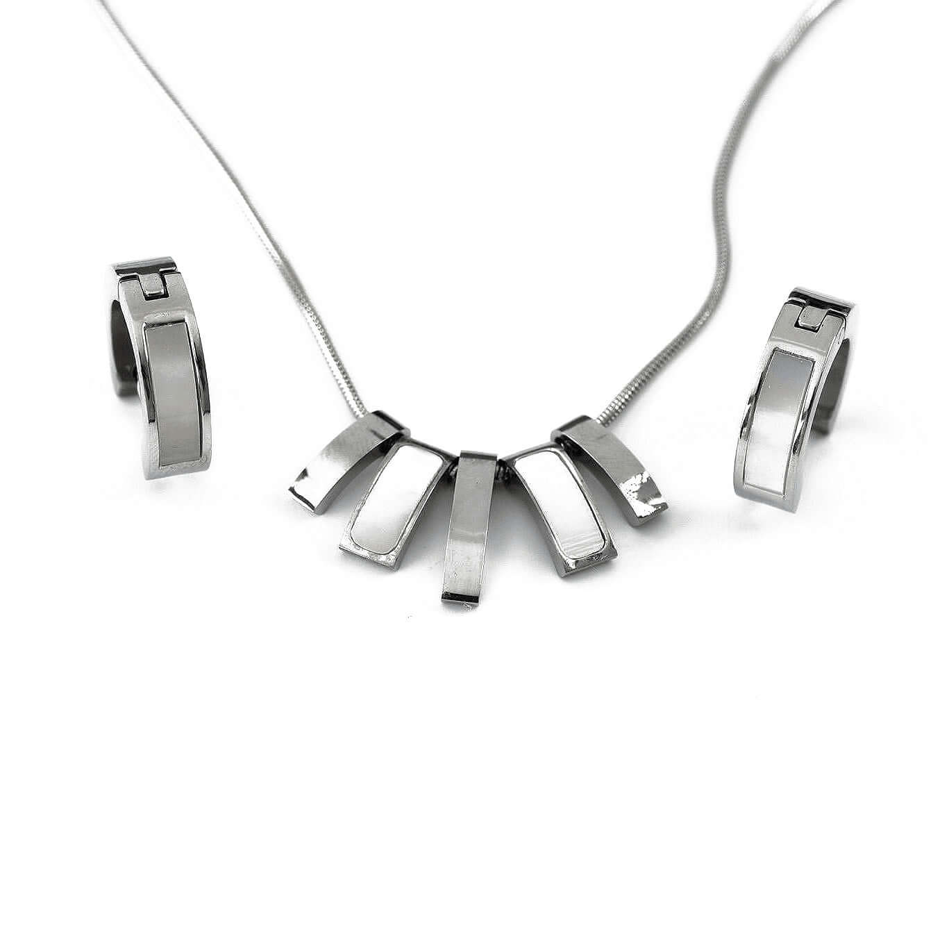 Елегантен комплект колие и обеци в сребрист цвят, изработени от висококачествена медицинска стомана и изискан седеф. Тези стилни бижута съчетават класическа изтънченост и модерна визия, идеални за ежедневието или специални поводи. Медицинската стомана е изключително устойчива на корозия и потъмняване, като същевременно е хипоалергенна и безопасна за чувствителна кожа. Седефът добавя деликатен блясък и елегантност, правейки този комплект изключителен акцент за всяка визия. Перфектни за дамите, които търсят семпли, но изискани бижута за работа или вечерно събитие