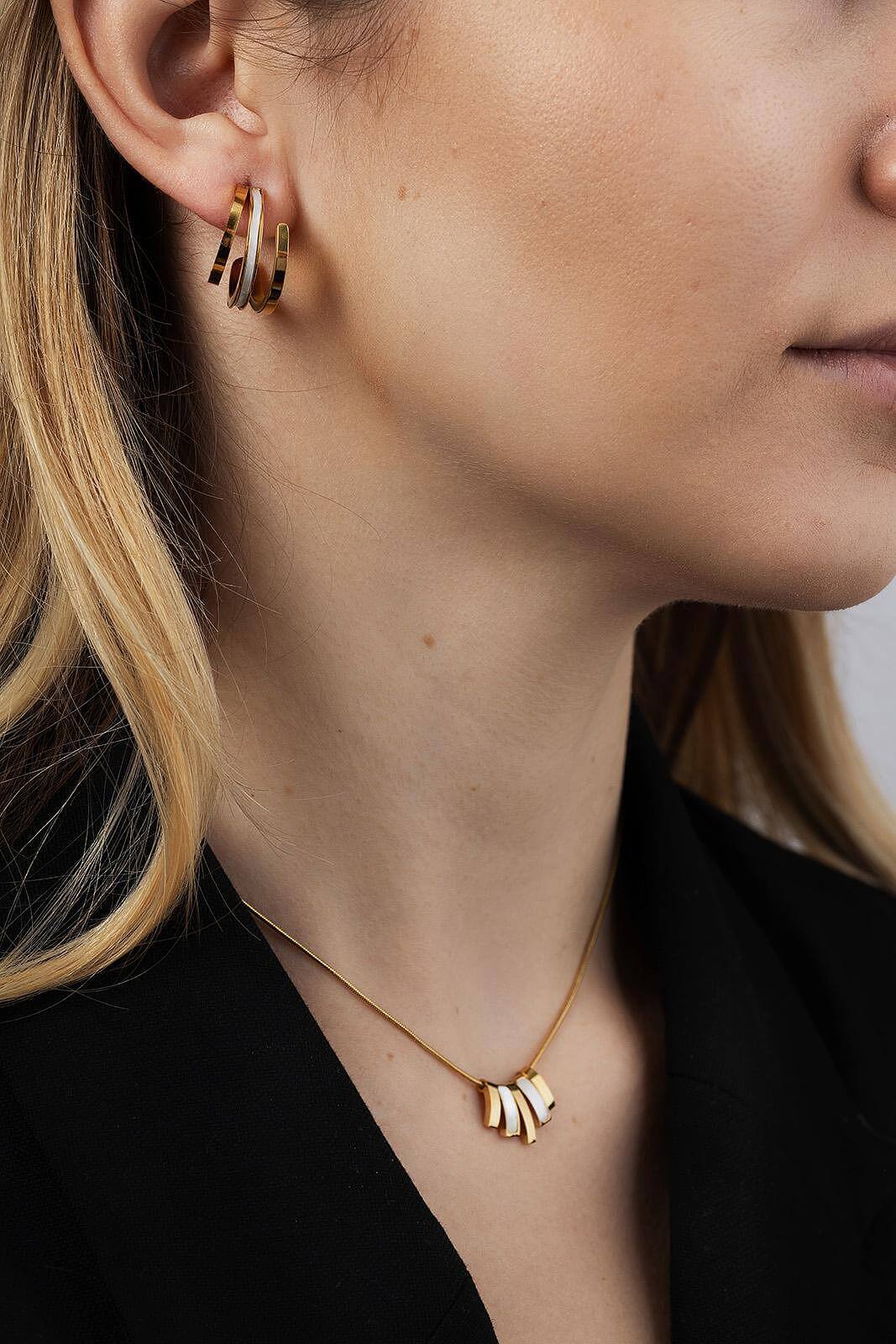 Комплект бижута: обеци и колие в златист цвят с модерен дизайн и стилни елементи.