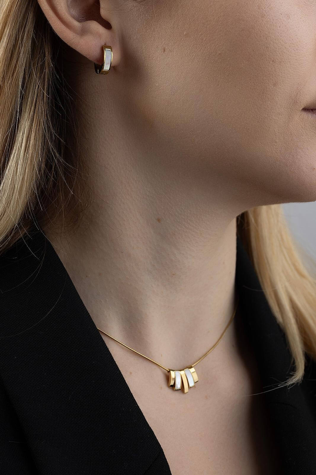 Комплект обеци и колие с деликатен дизайн, изработени от сребрист медицинска стомана и седеф.