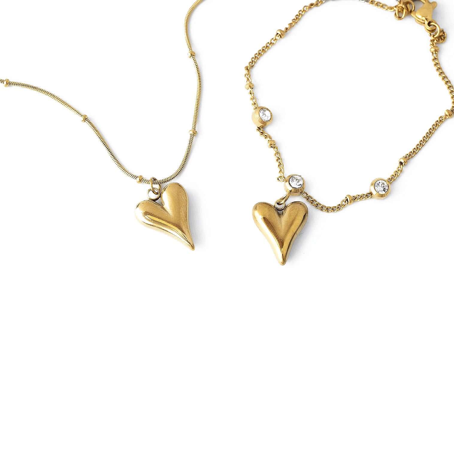 Златист комплект колие и гривна с висулки във формата на сърце, изработен от медицинска стомана.