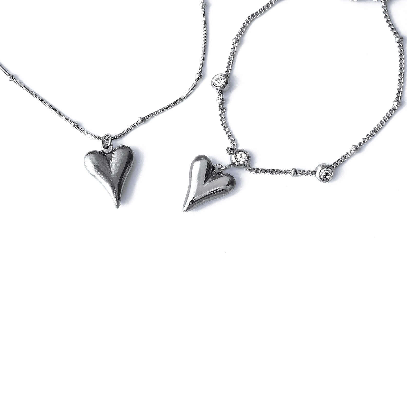 Комплект колие и гривна със сърце, изработени от медицинска стомана, носени от жена.