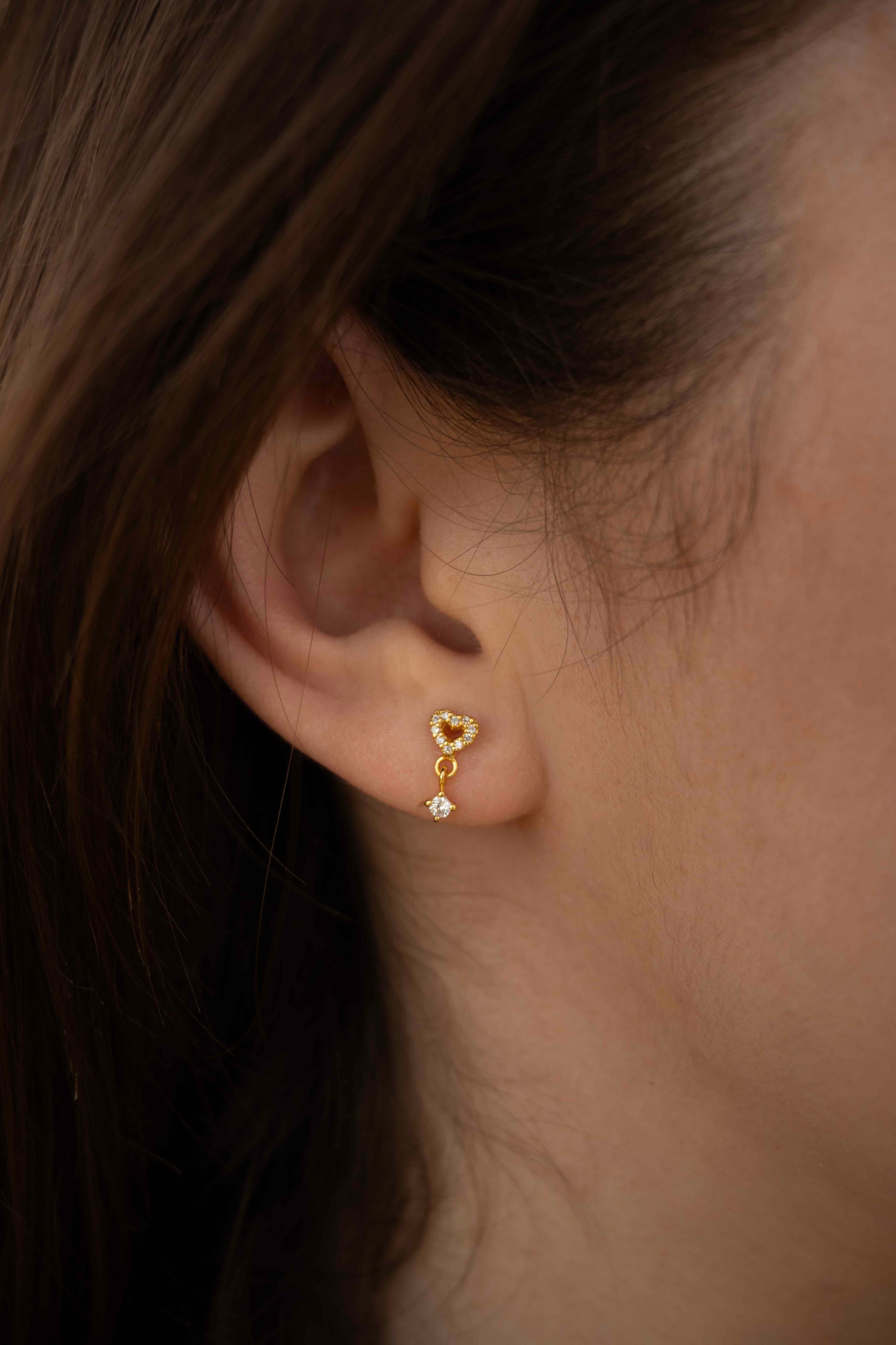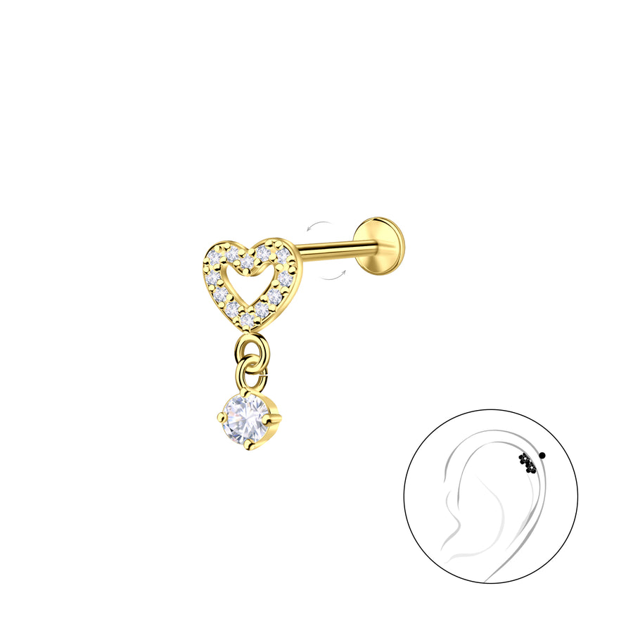 Сребърно Сърце с Кристали с 14К Златно Покритие S925, пиърсинг за ухо с кристали.