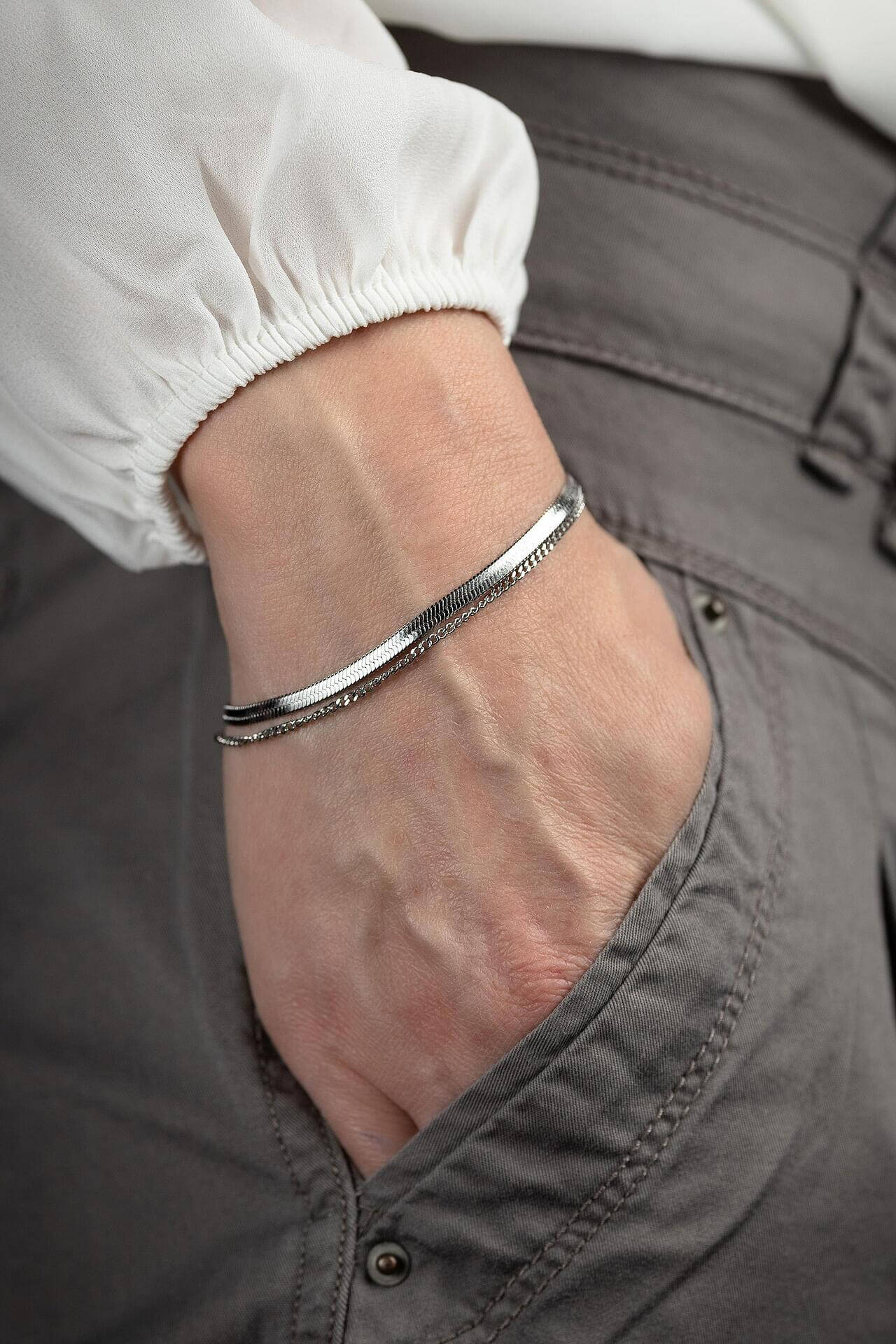 Двойна мека гривна сребриста със змийска плетка. Семпла и изчистена, подходяща за всеки повод.