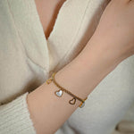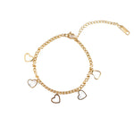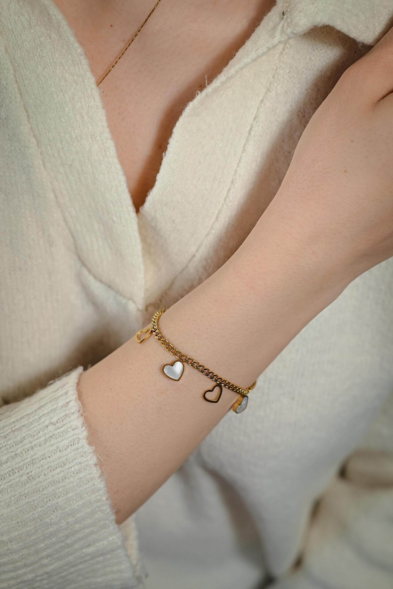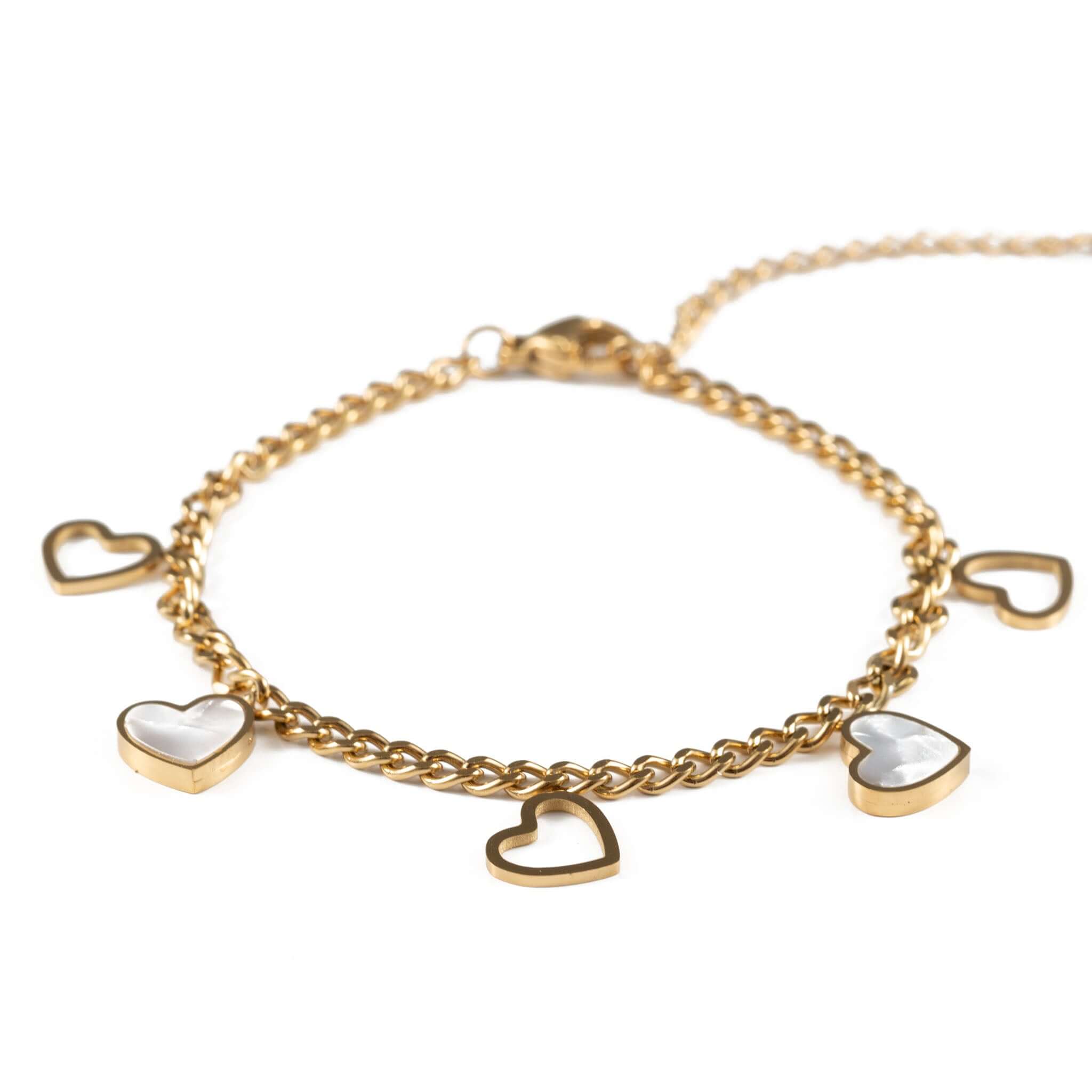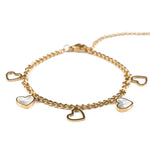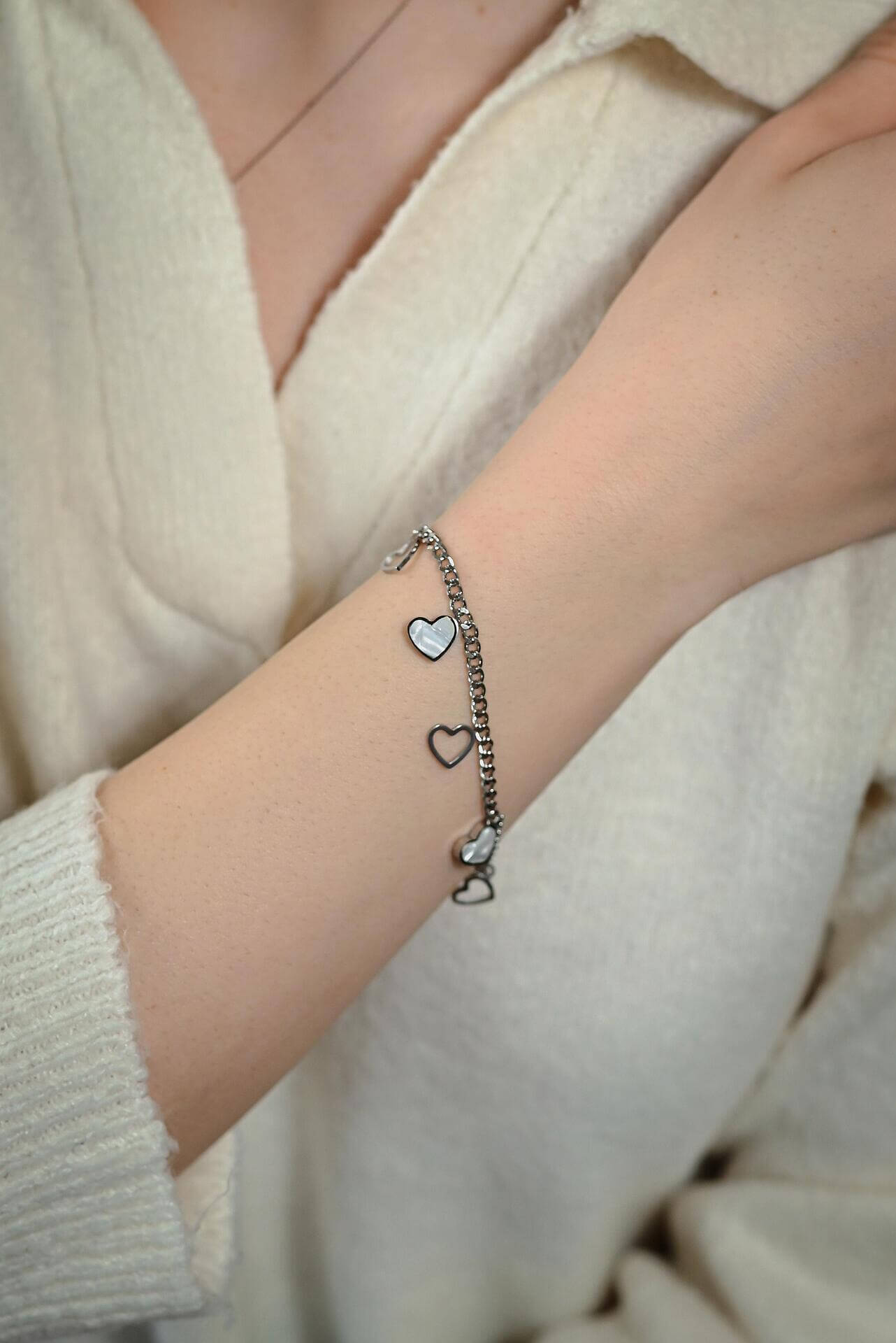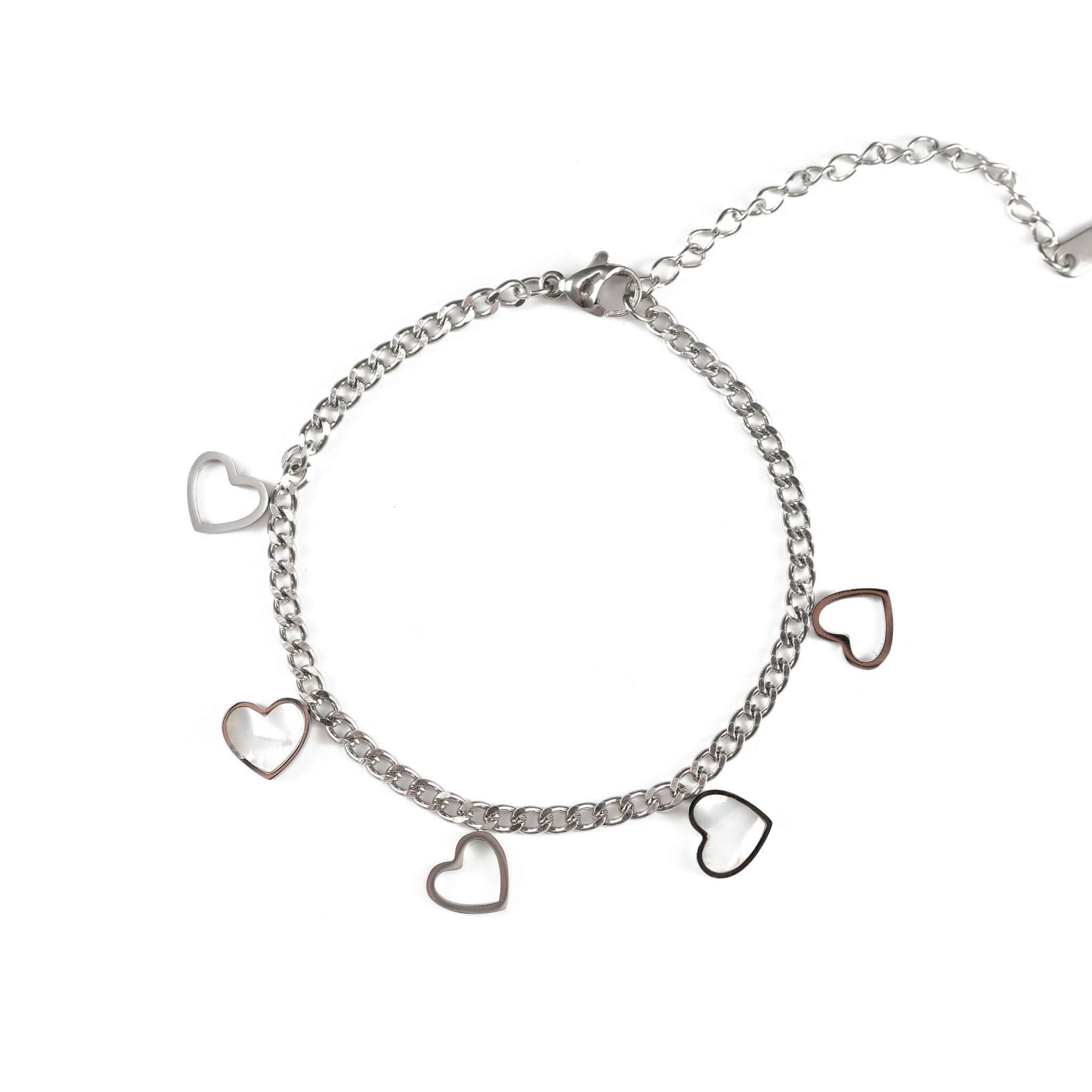 Тази мека гривна със седеф е изработена от висококачествена стомана и има висулки във формата на сърце. Тя е елегантно и нежно бижу, което е подходящо за всеки повод.