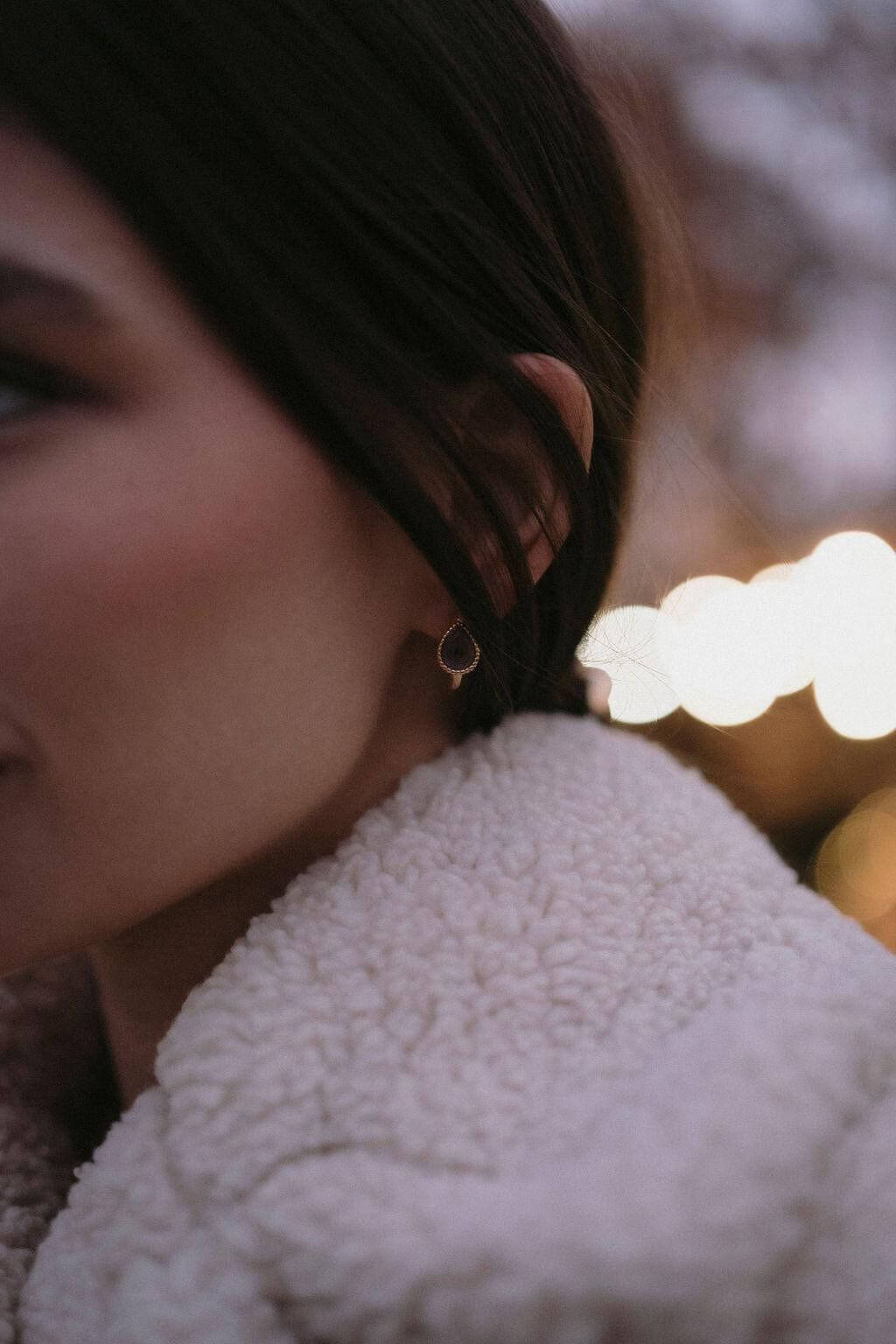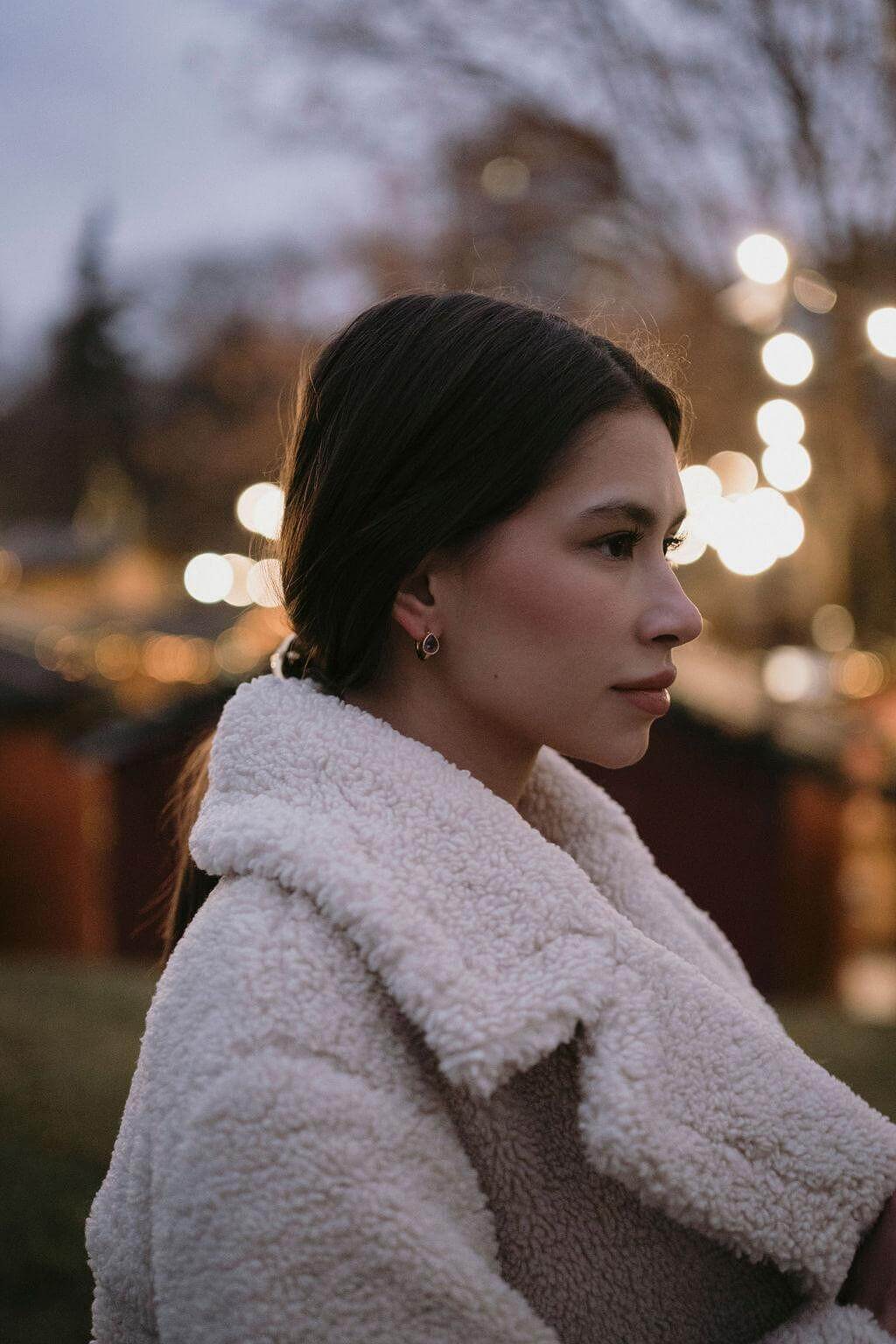 Млада жена в бяла палто с елегантни обеци, на фона на вечерни светлини.
