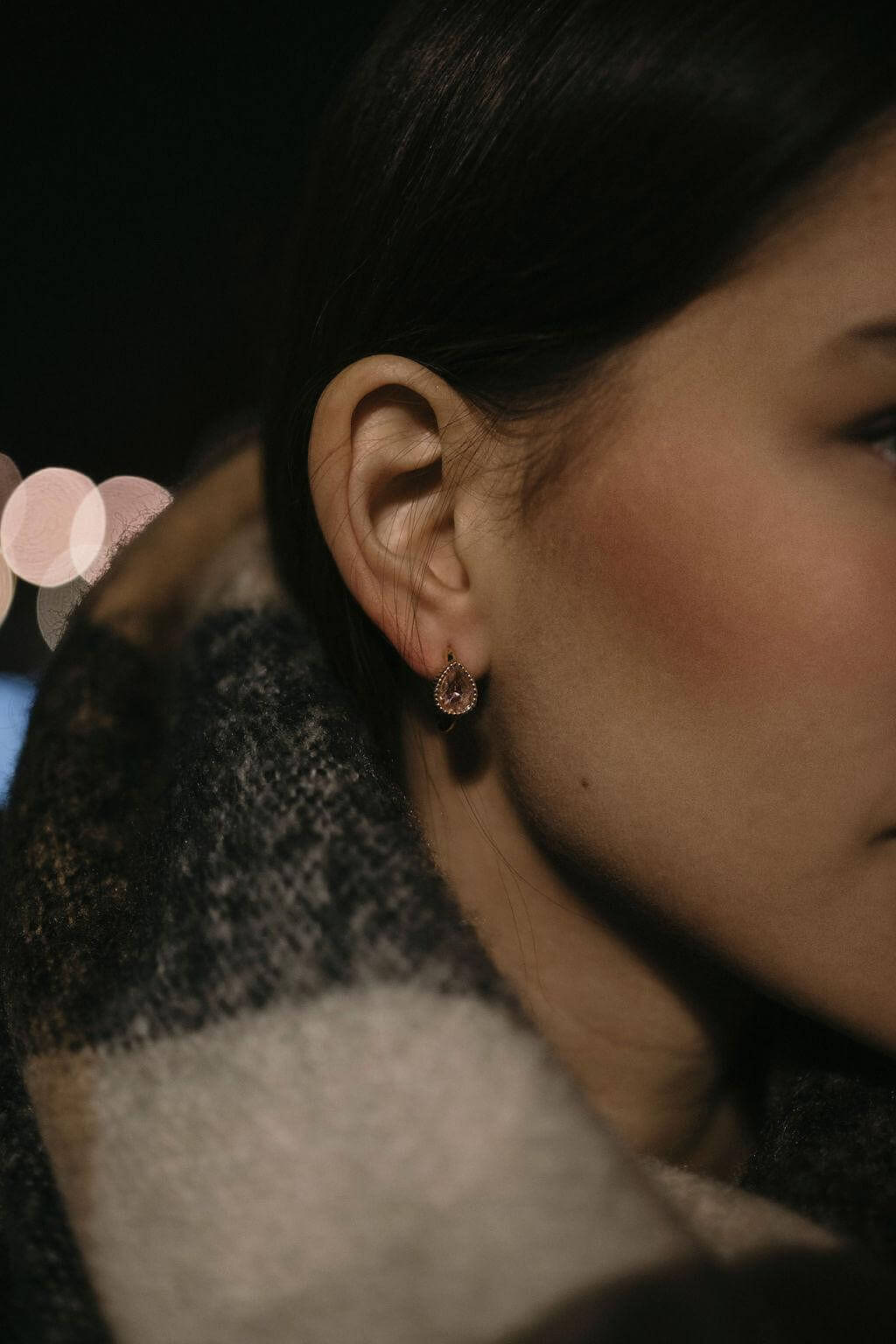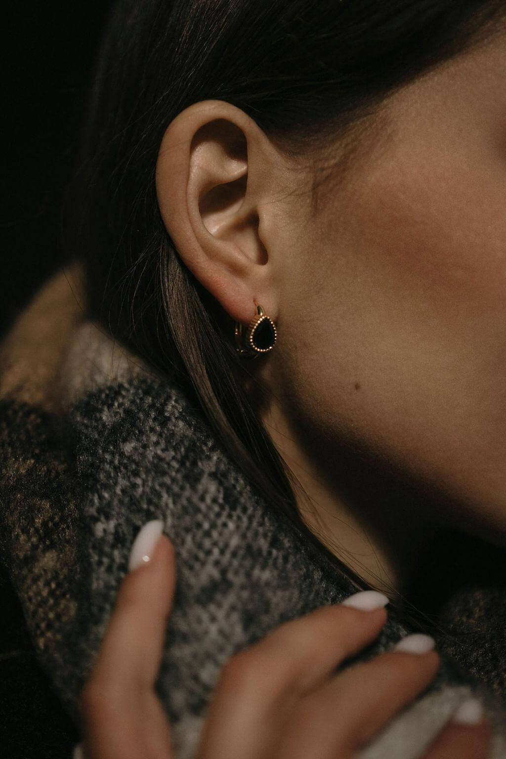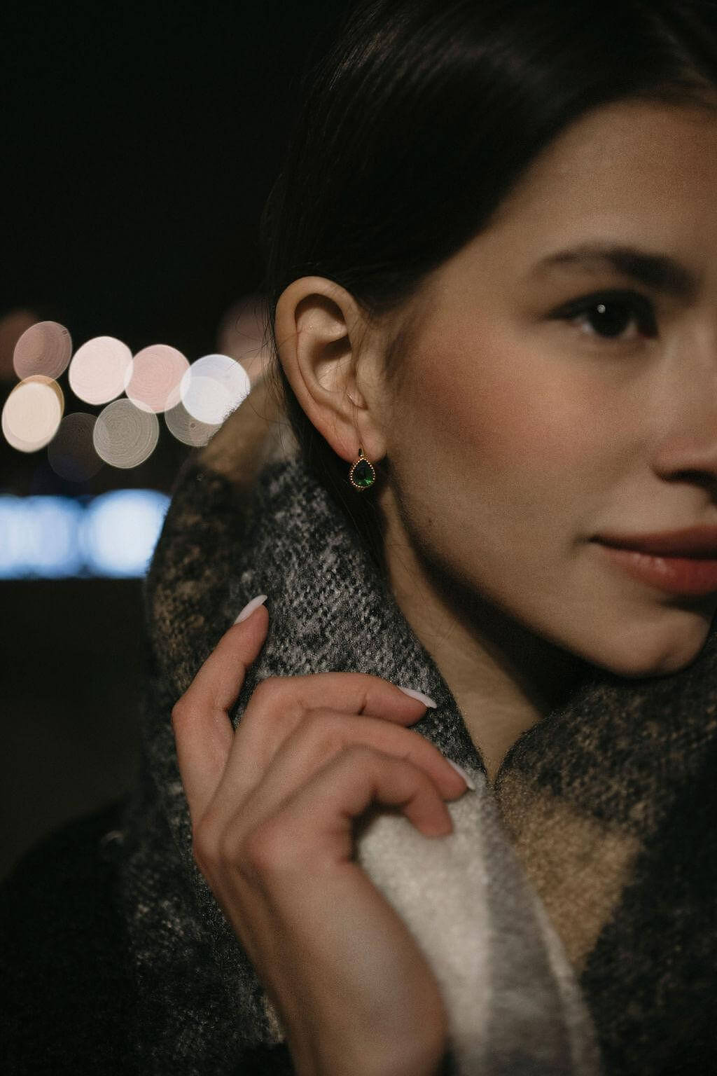 Млада жена с златисти обеци с многонюансни кристали, облечена в тъмен шал, на фона на размазани светлини.