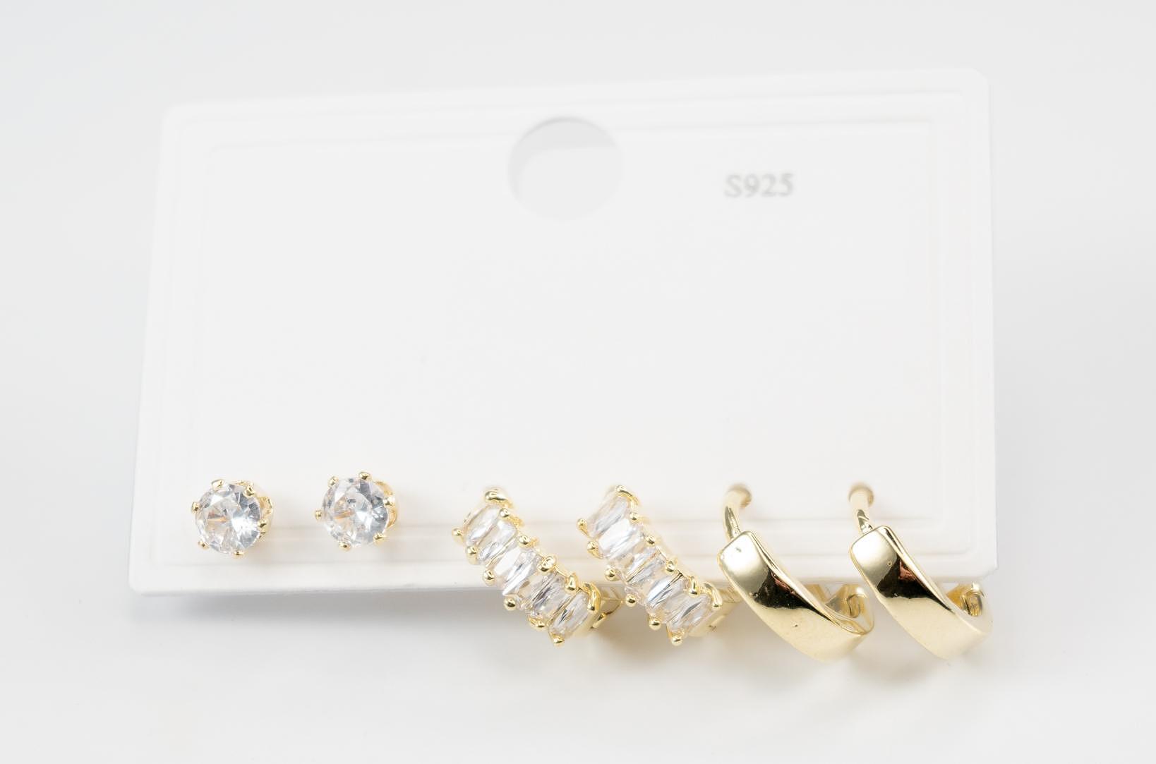 Открийте най-новата тенденция в бижутата с тези модерни обеци за три пиърсинг дупки, създадени за стилни и смели визии. Перфектно съчетание на елегантност и индивидуалност, този комплект е проектиран да подчертае красотата на многобройните пиърсинги с хармоничен и завършен вид