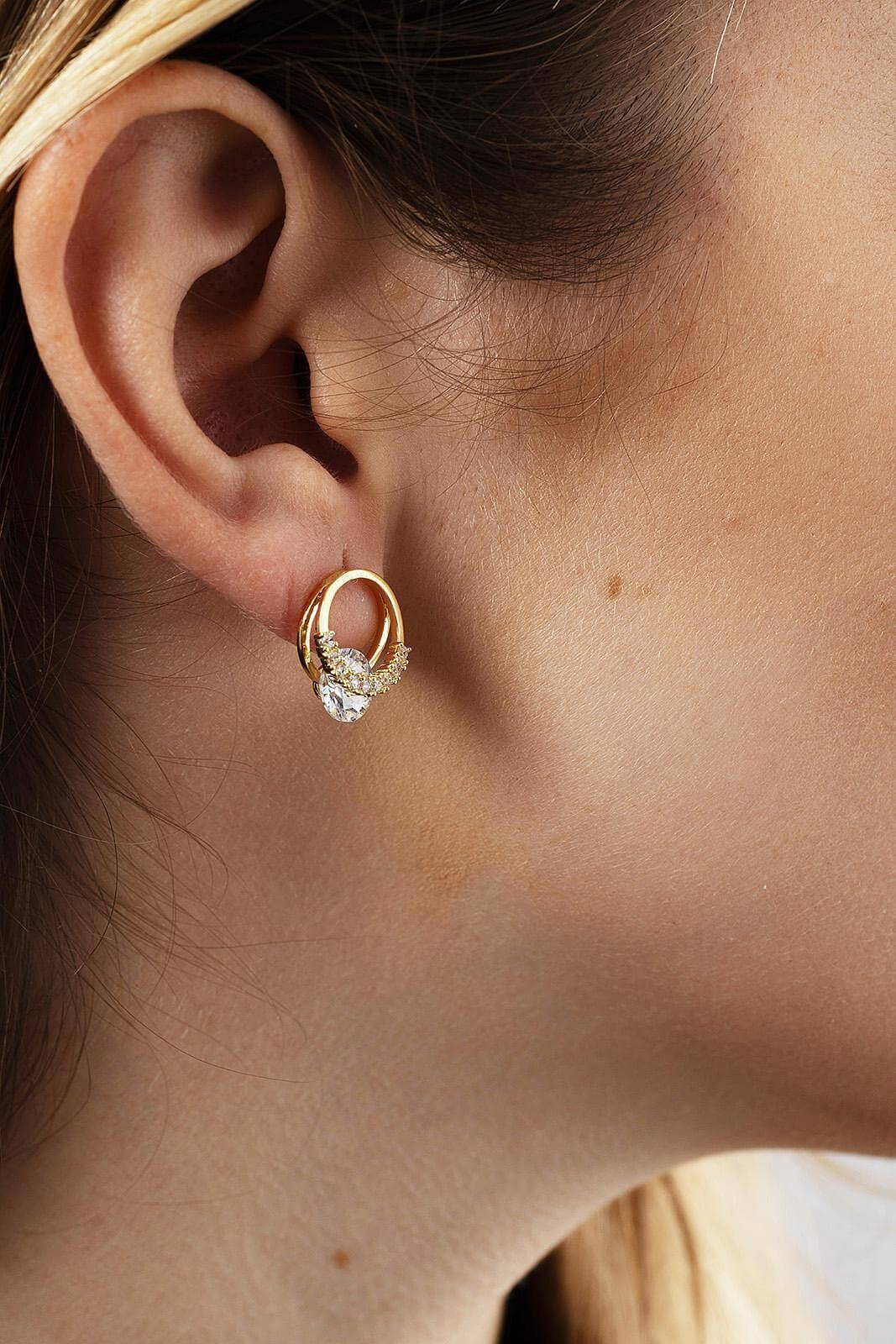 Обeци с блестящ камък в златист цвят, носени от жена, подчертаващи елегантността и стилa.