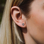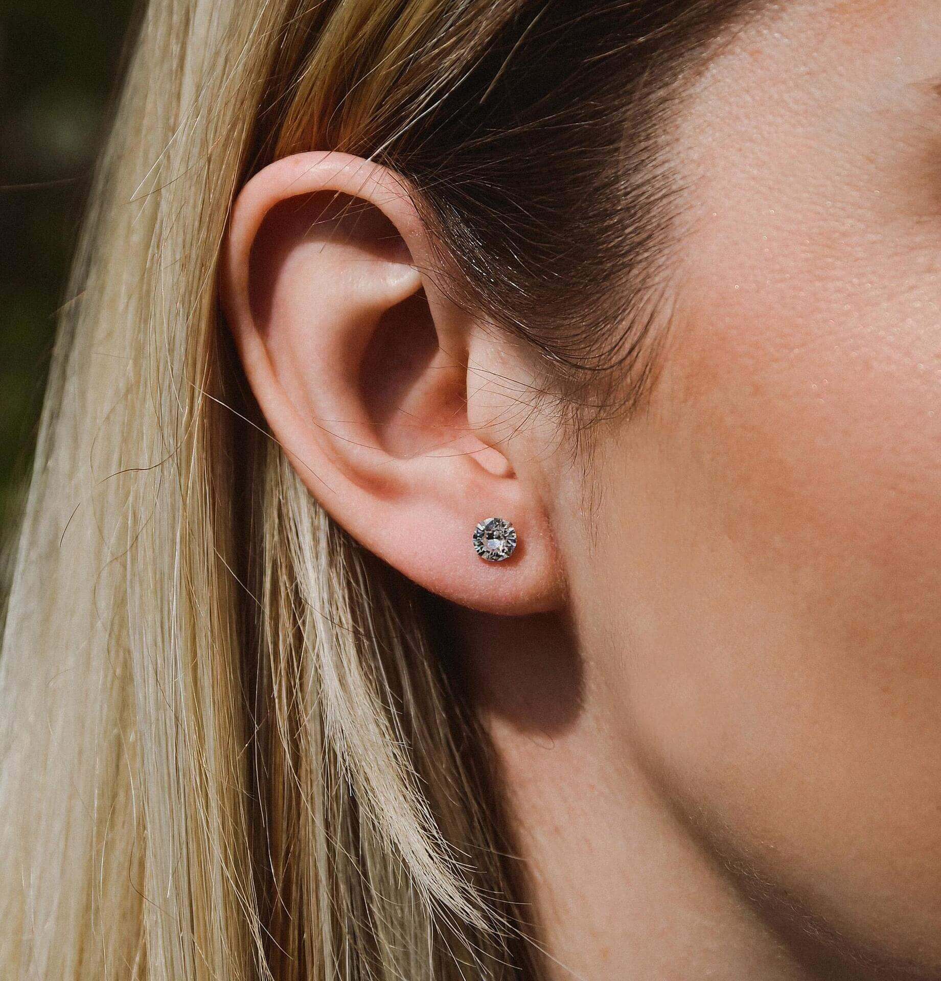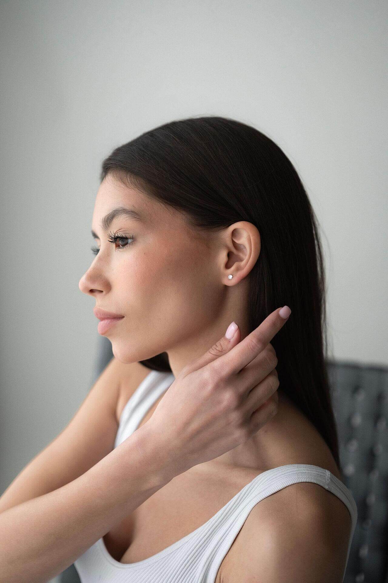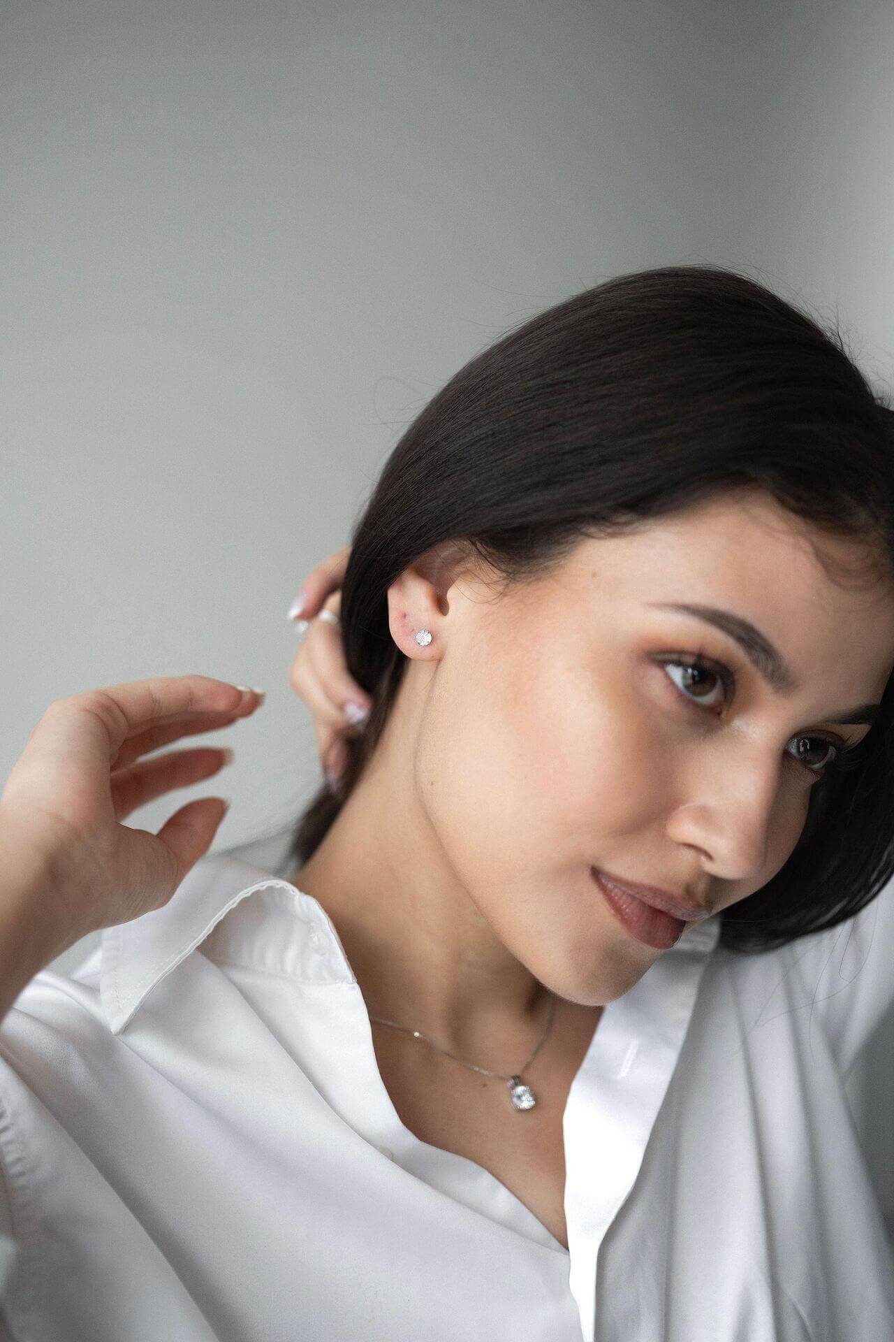 Млада жена с черна коса носи сребърни обеци Нежност S925, облечена с бяла риза.