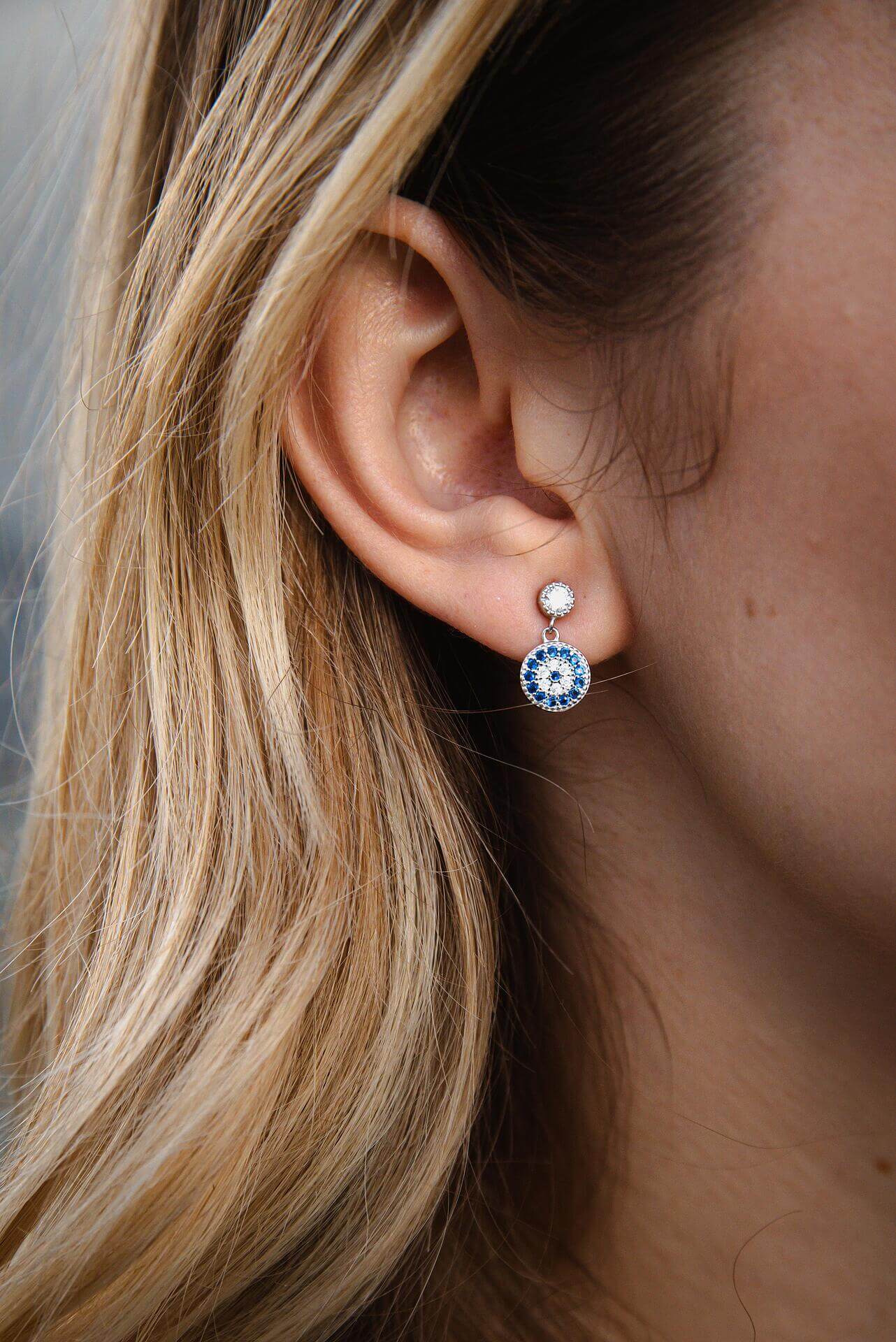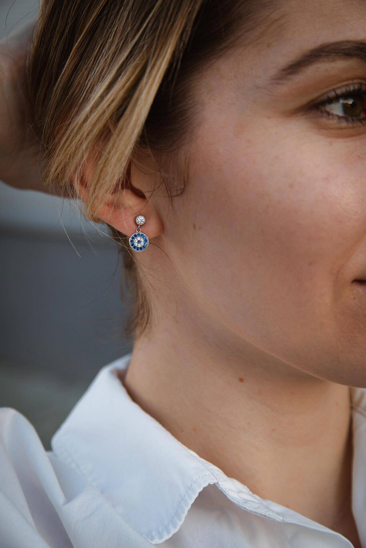 Сребърни обеци с окото на Хамса S925, носени от жена, излъчваща стил и символика.