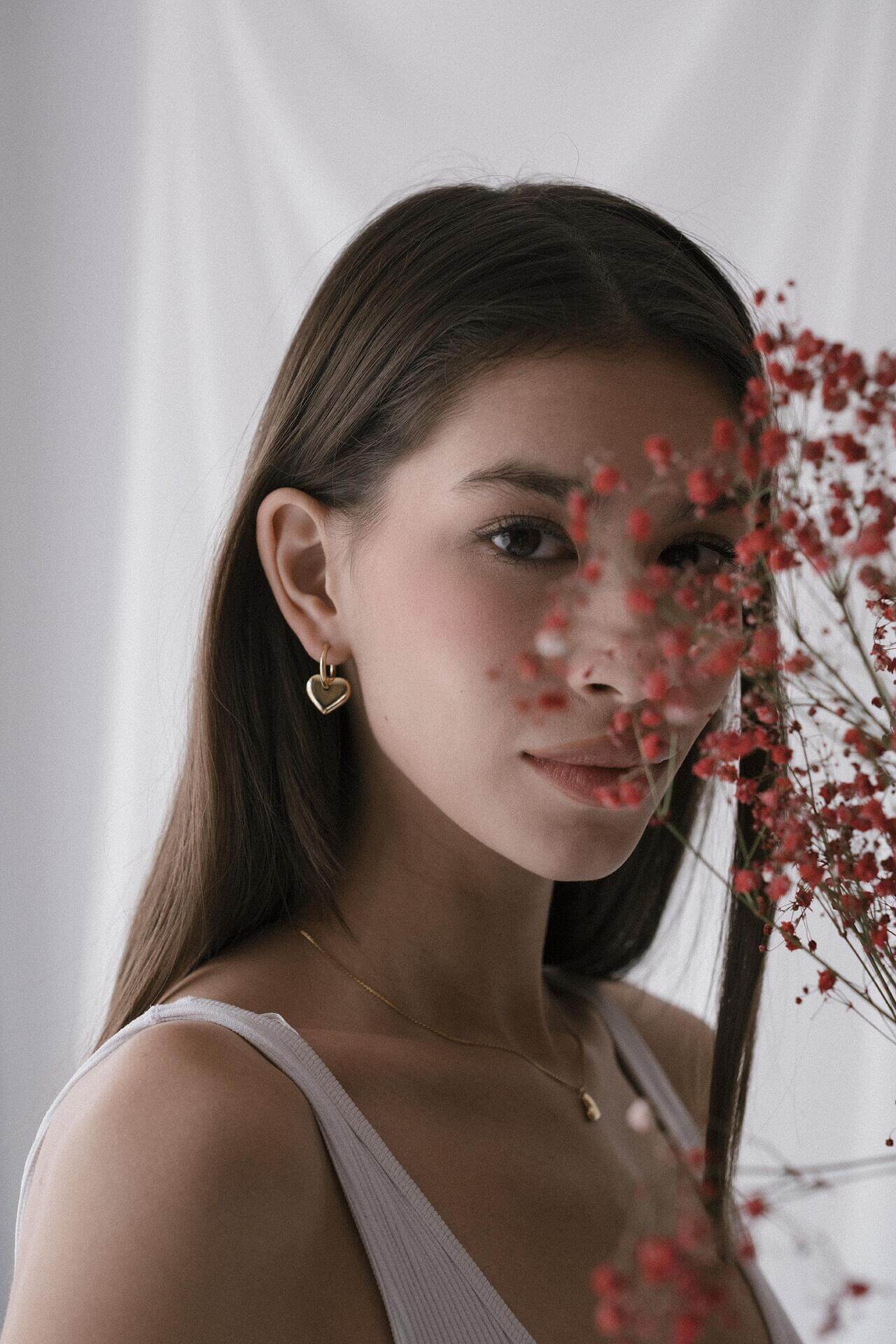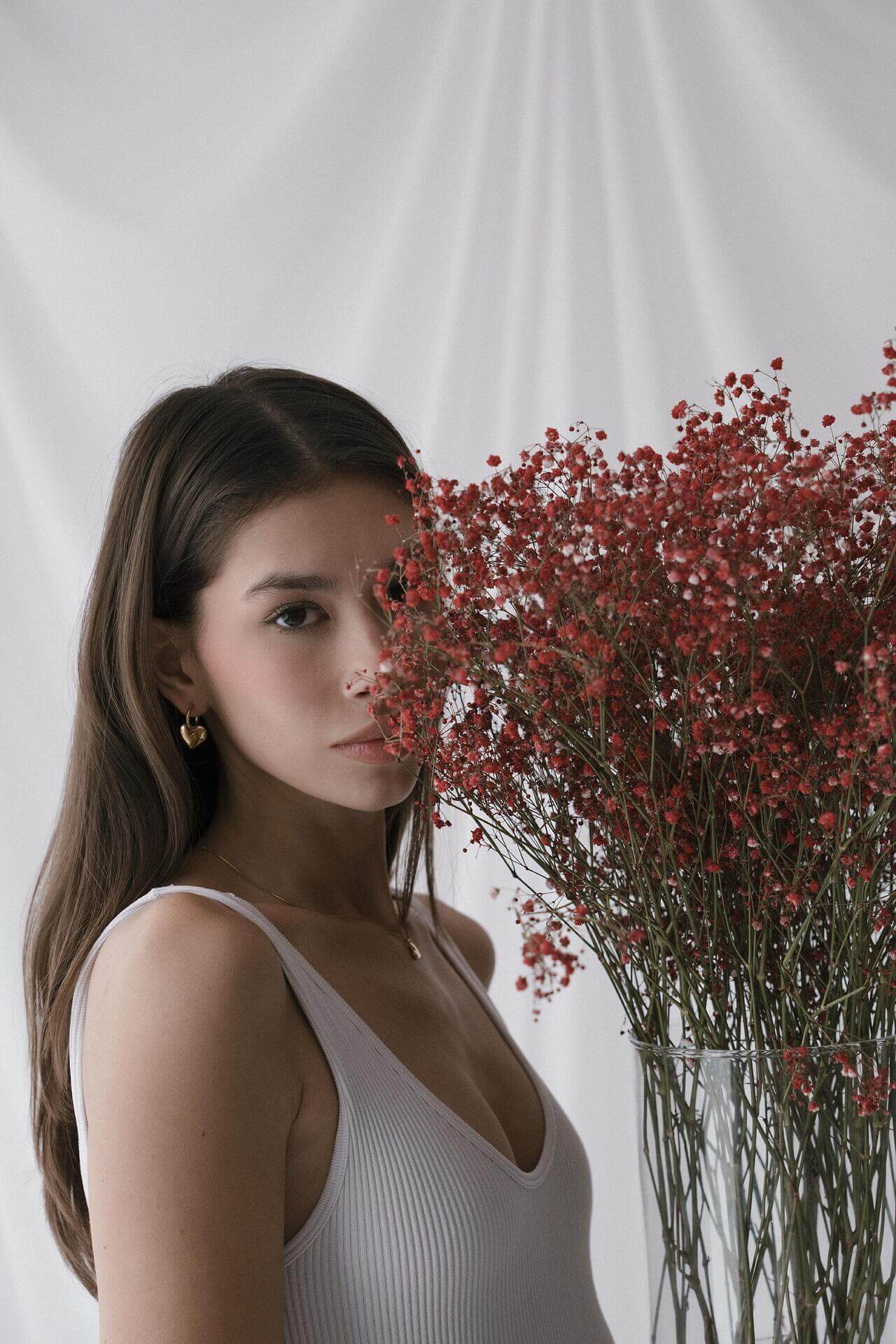 Млада жена с тъмна коса държи букет от червени цветя, носеща златни обеци и облечена в бяла тениска.