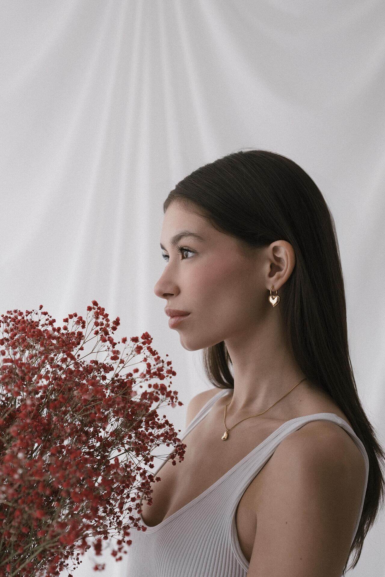 Жена с обеци сърце от 18K златно покритие, зад която се виждат червени цветя.