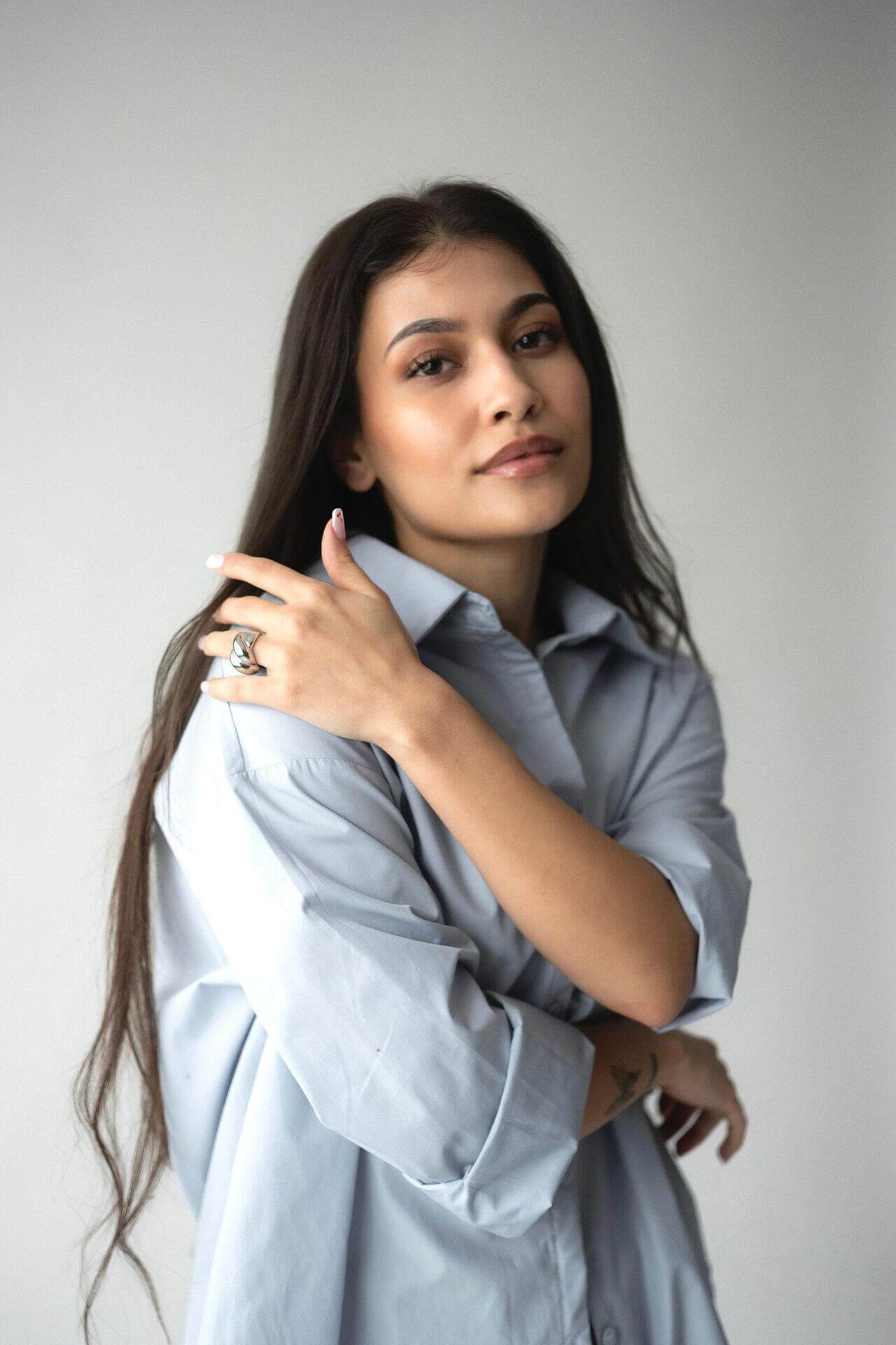 Млада жена с дълга коса носи chunky пръстен с 18К златно покритие, облечена в светлосиня риза.
