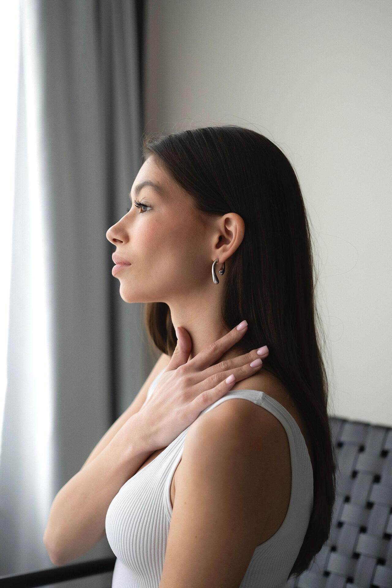 Woman wearing Liquid Drop earrings with 18K gold plating, posing thoughtfully in a stylish setting.