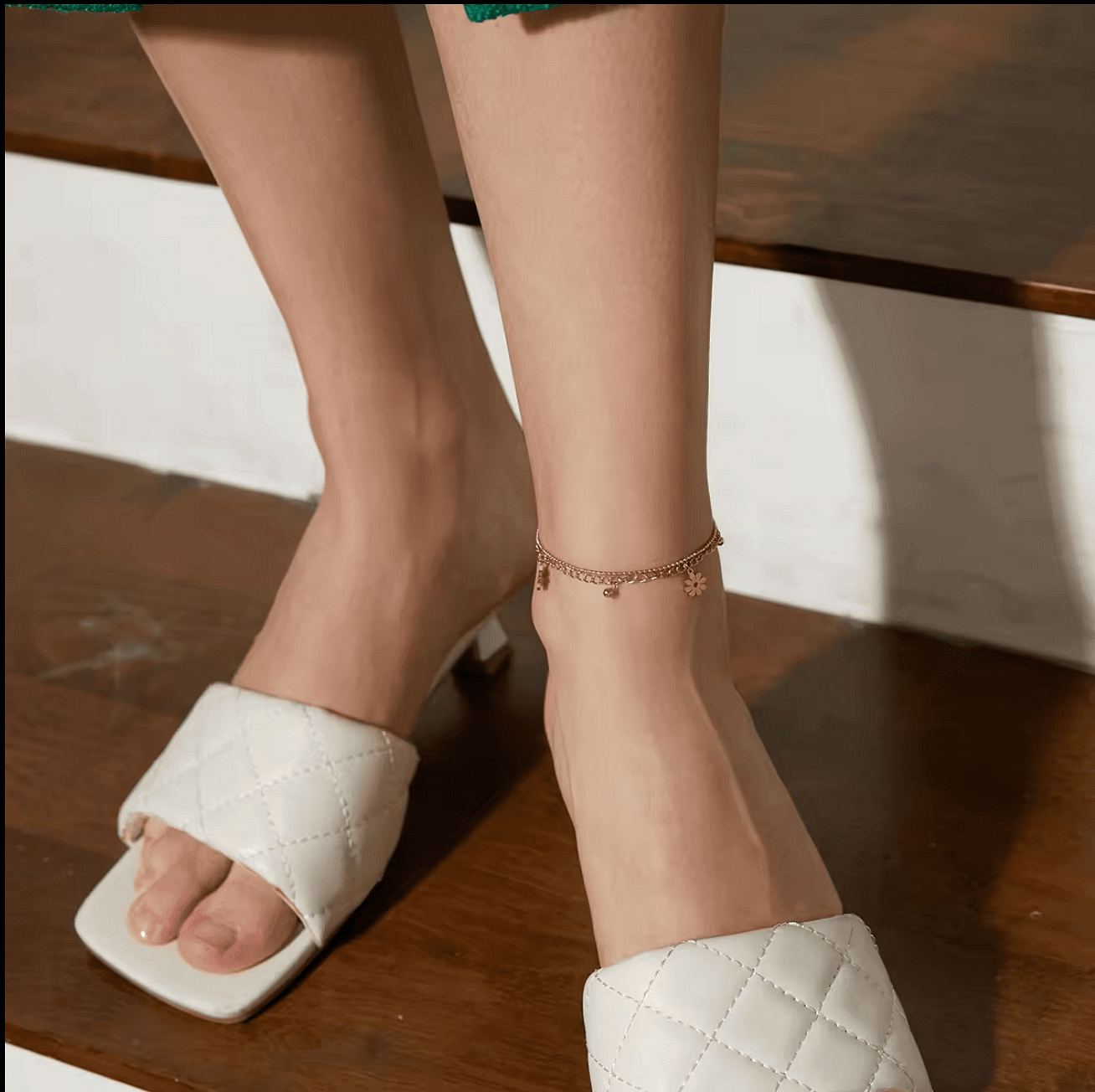 Двойна гривна за глезен с цвете и 18K златно покритие върху женски крак.