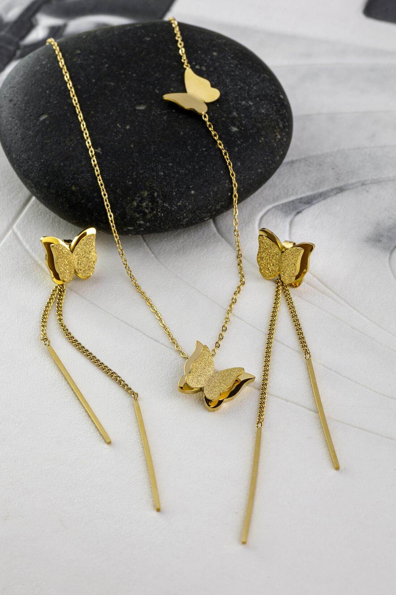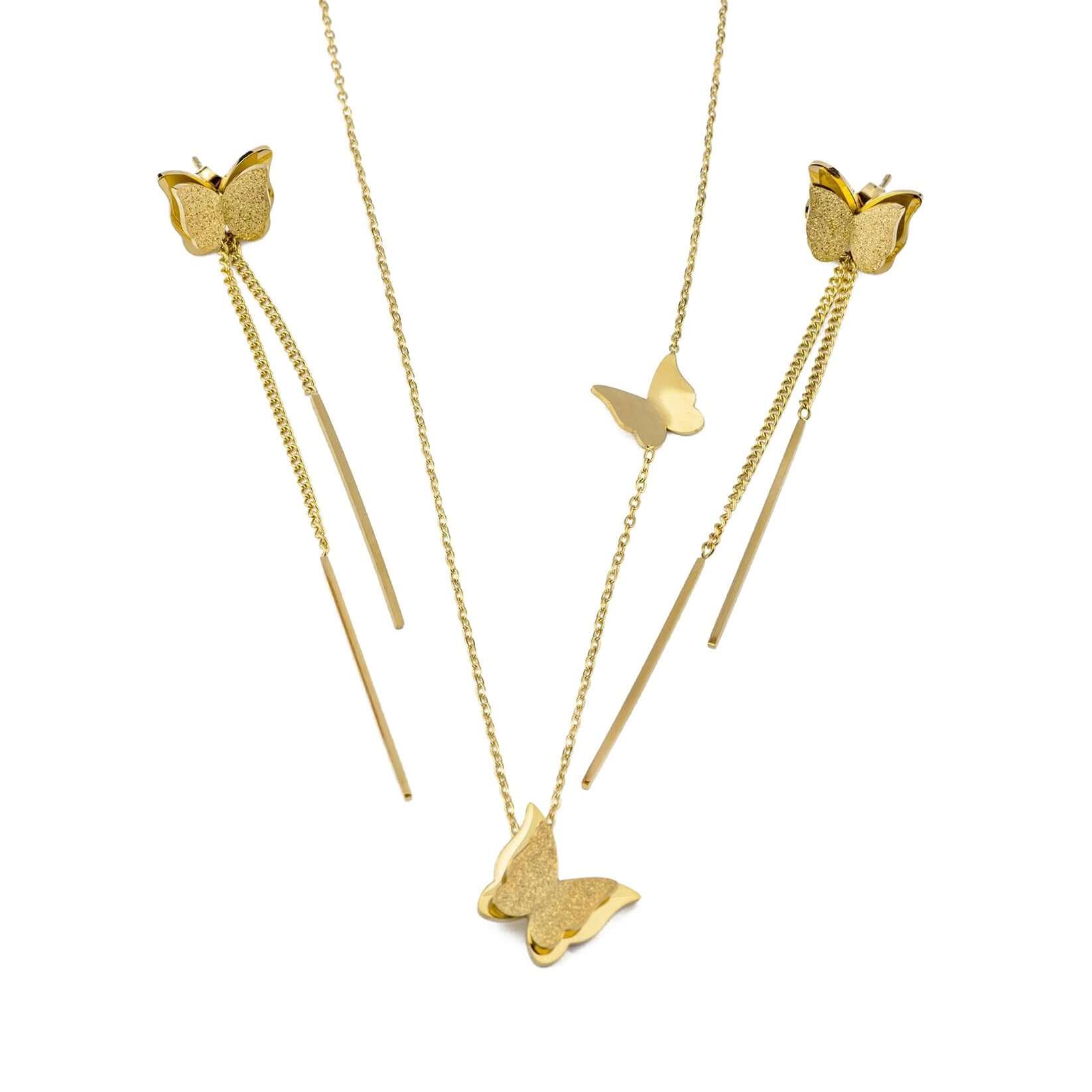 Комплект златисто колие + дълги обеци пеперуда
