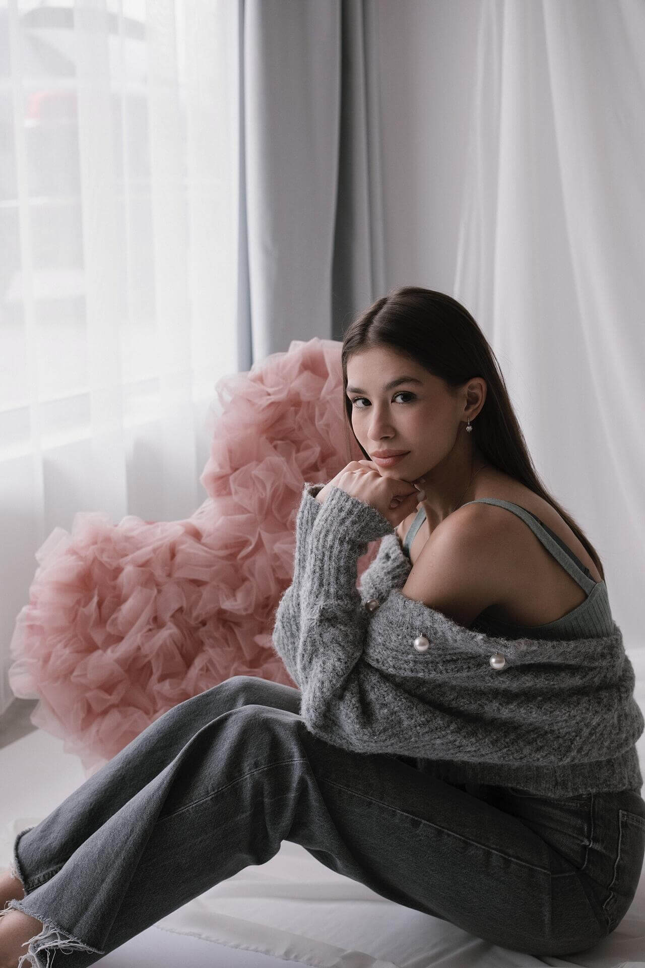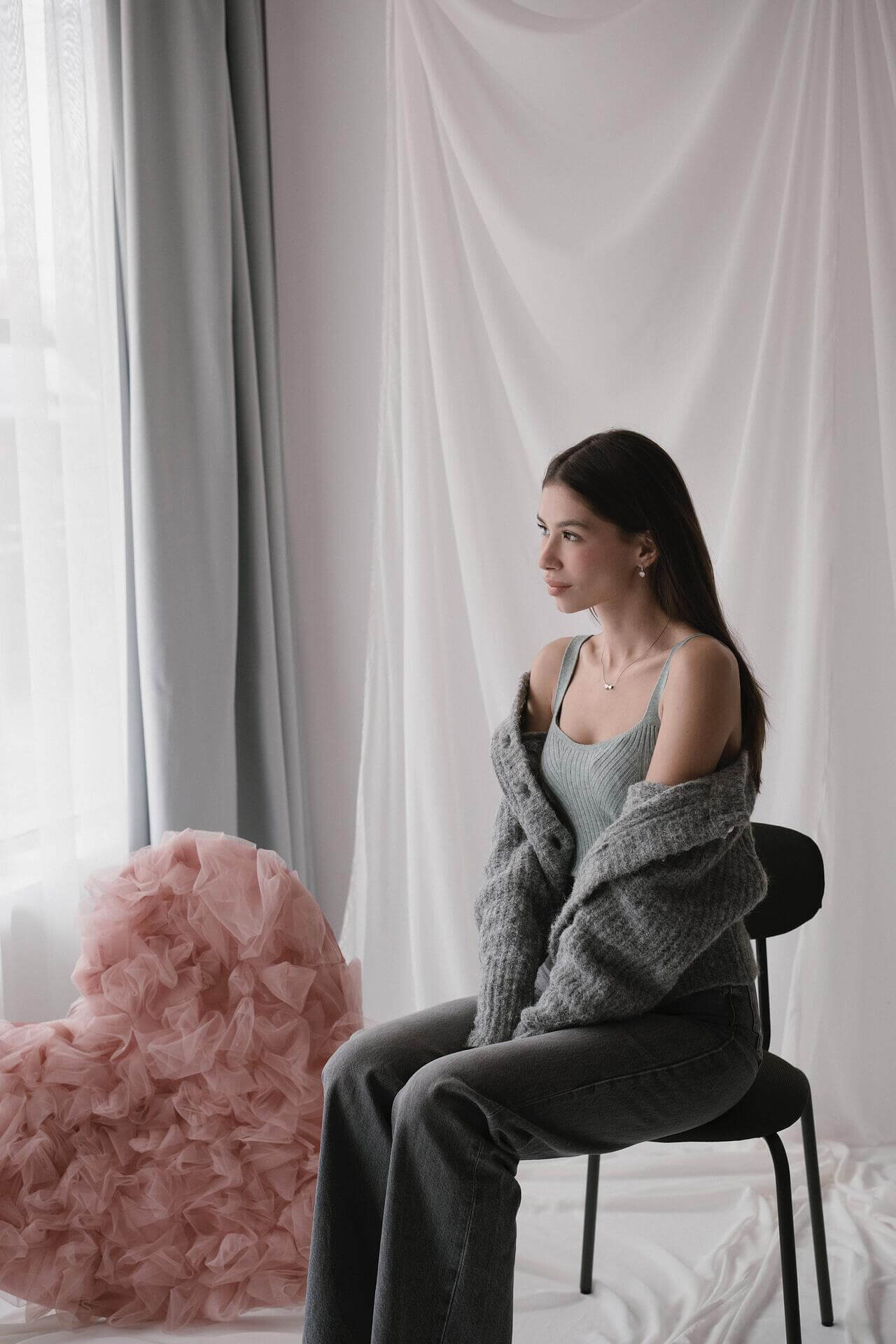 Млада жена в сива жилетка с огледален вид, седнала пред розово сърце и завеси.