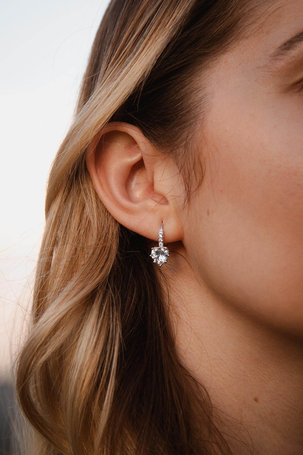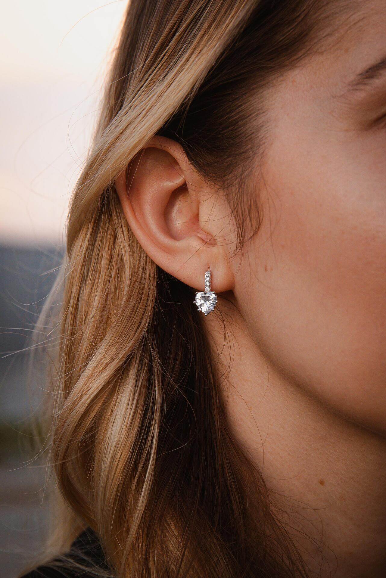 Елегантни сребърни обеци с форма на сърце, носени от жена с дълга коса на фон на залез.