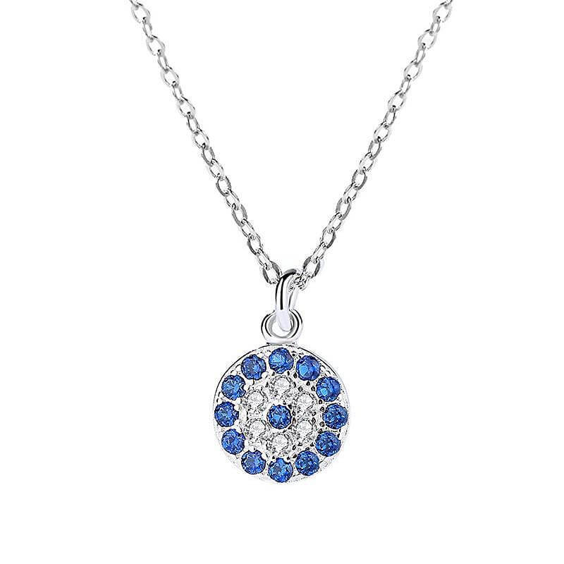 Сребърно колие с синьо камъче, кръгъл медальон, стилно бижу, символ на защита и хармония.